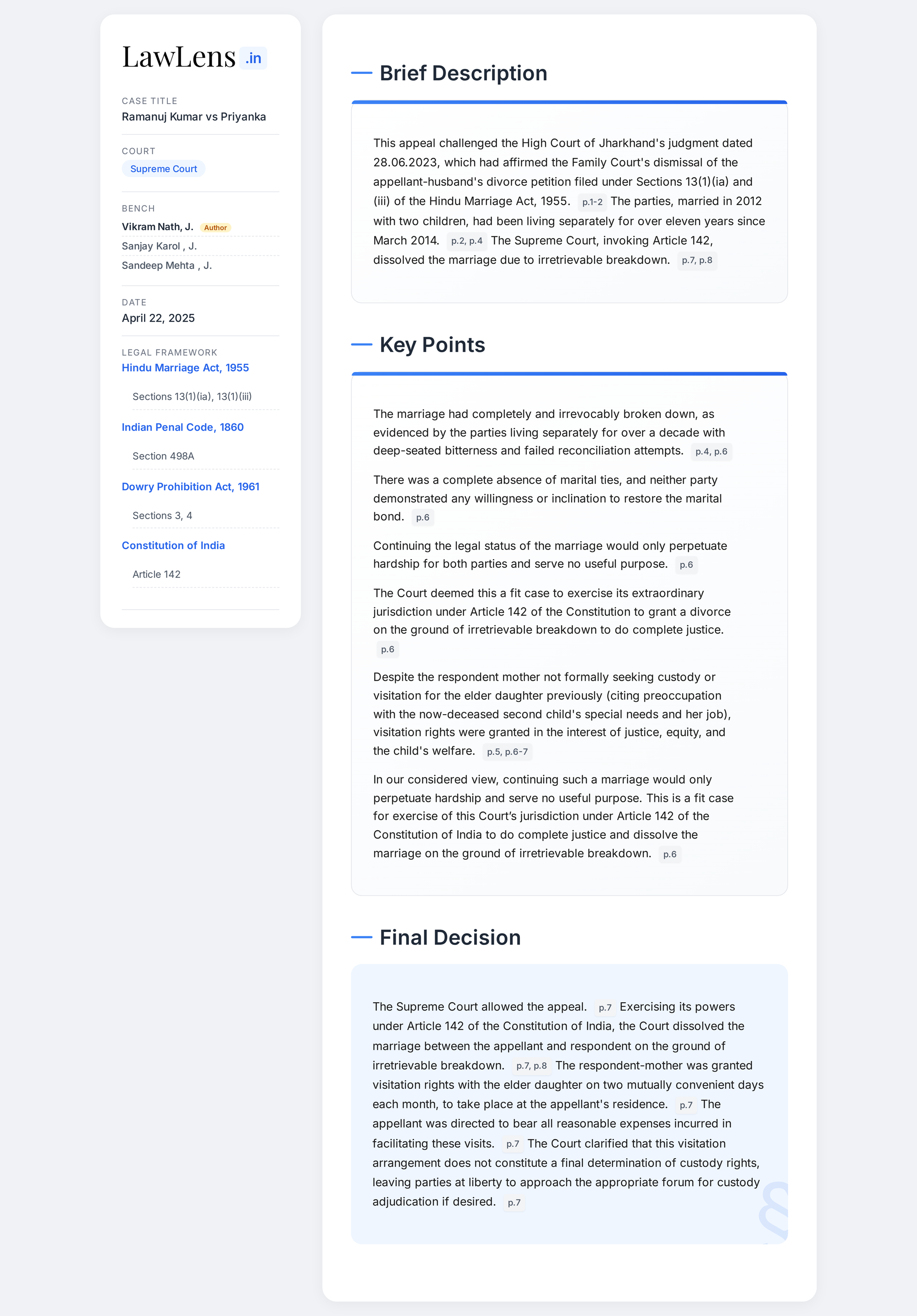 Ramanuj Kumar vs Priyanka 2025 INSC 543 - Dissolution Of Marriage Invoking Art. 142 Powers