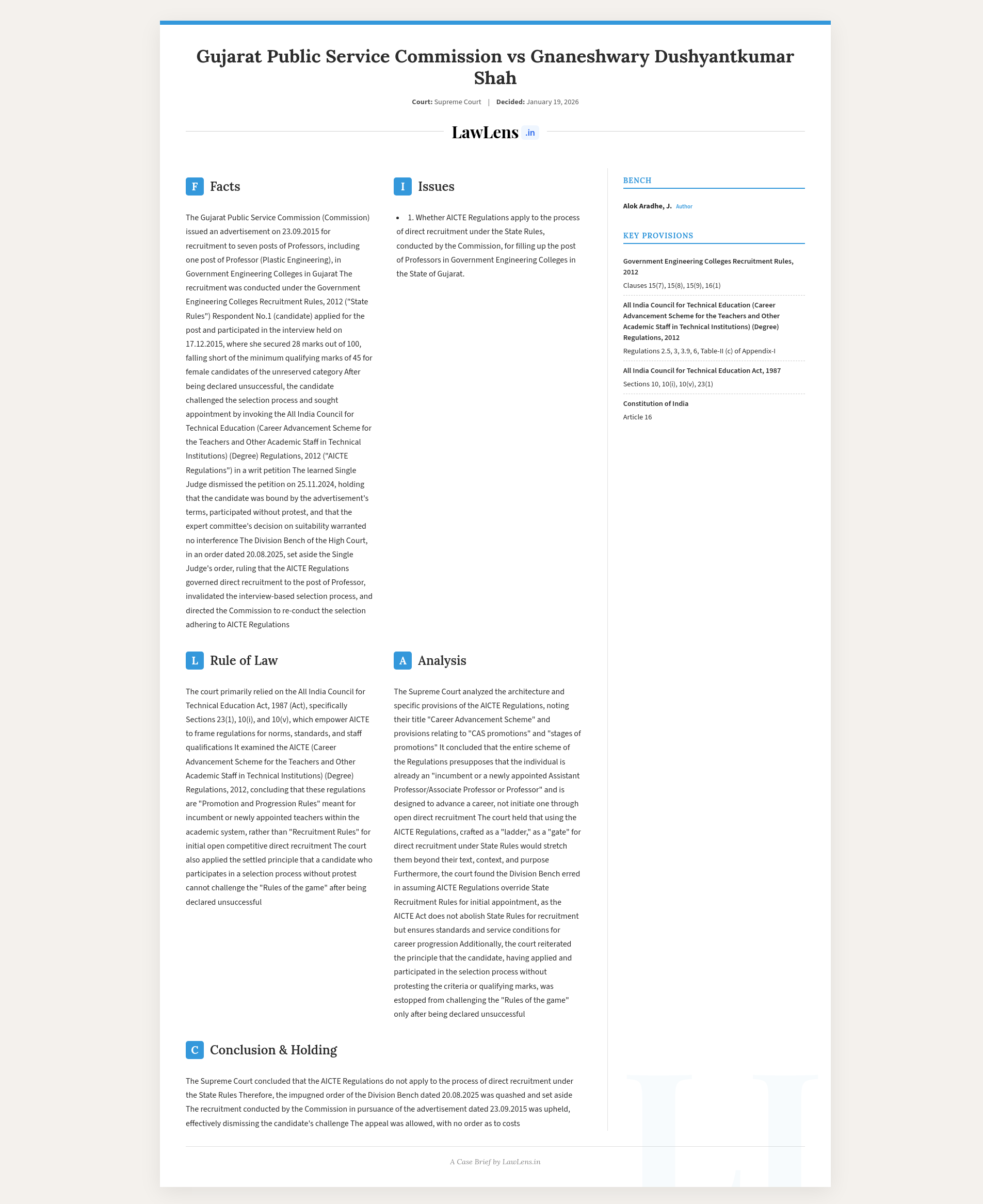 Gujarat Public Service Commission v. Gnaneshwary Dushyantkumar Shah ., 2026 INSC 70 - AICTE Regulations - Recruitment Of Professors
