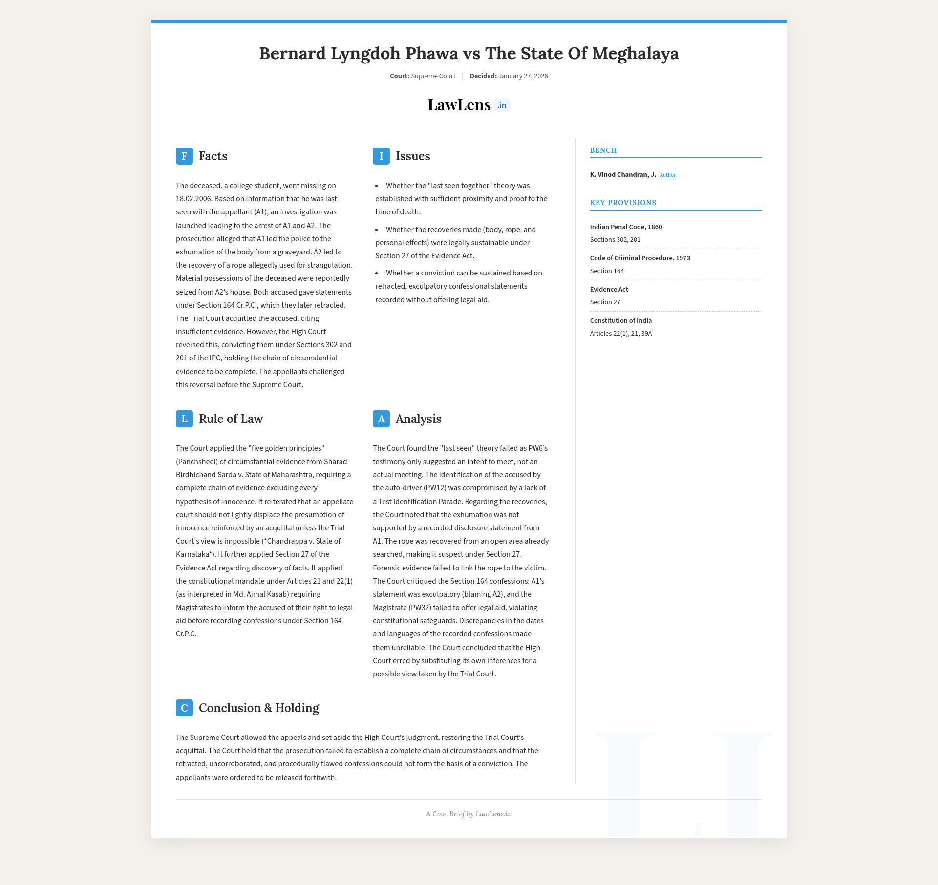 Bernard Lyngdoh Phawa v. State of Meghalaya 2026 INSC 85 - Evidence Act - Confession - Last Seen Together