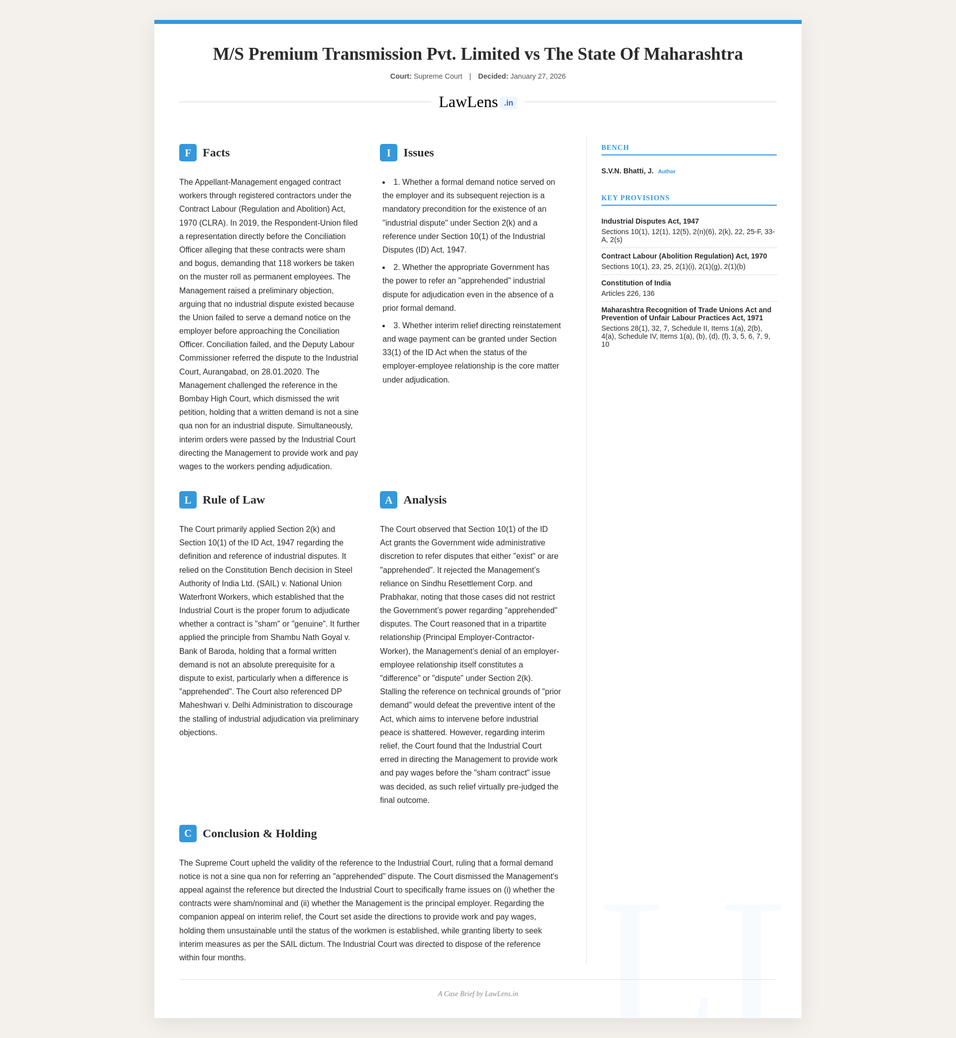 Premium Transmission Private Limited v. State of Maharashtra 2026 INSC 87 - S. 10 Industrial Disputes Act