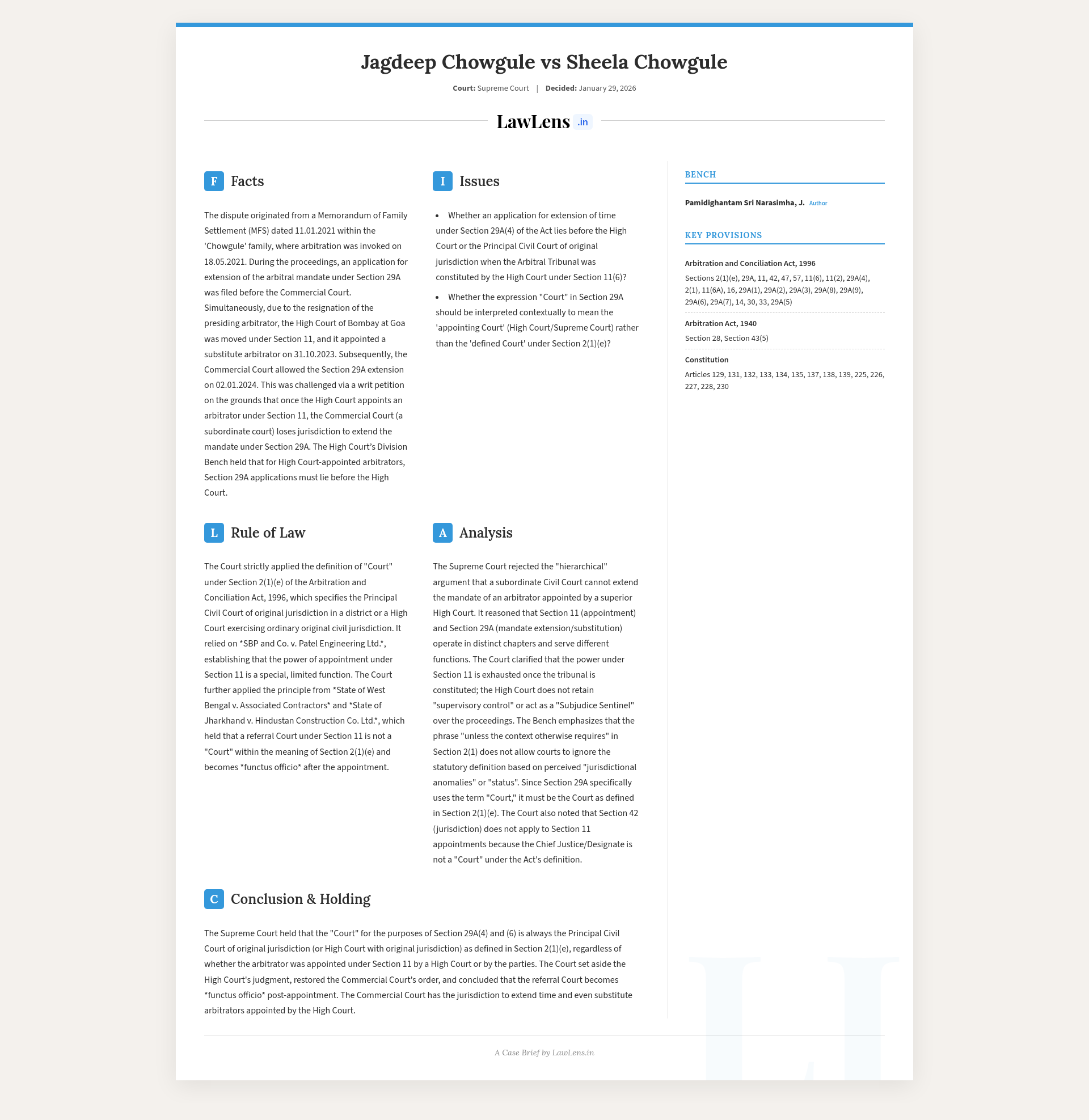 Jagdeep Chowgule v. Sheela Chowgule 2026 INSC 92 - S.29A Arbitration Act - Court Definition