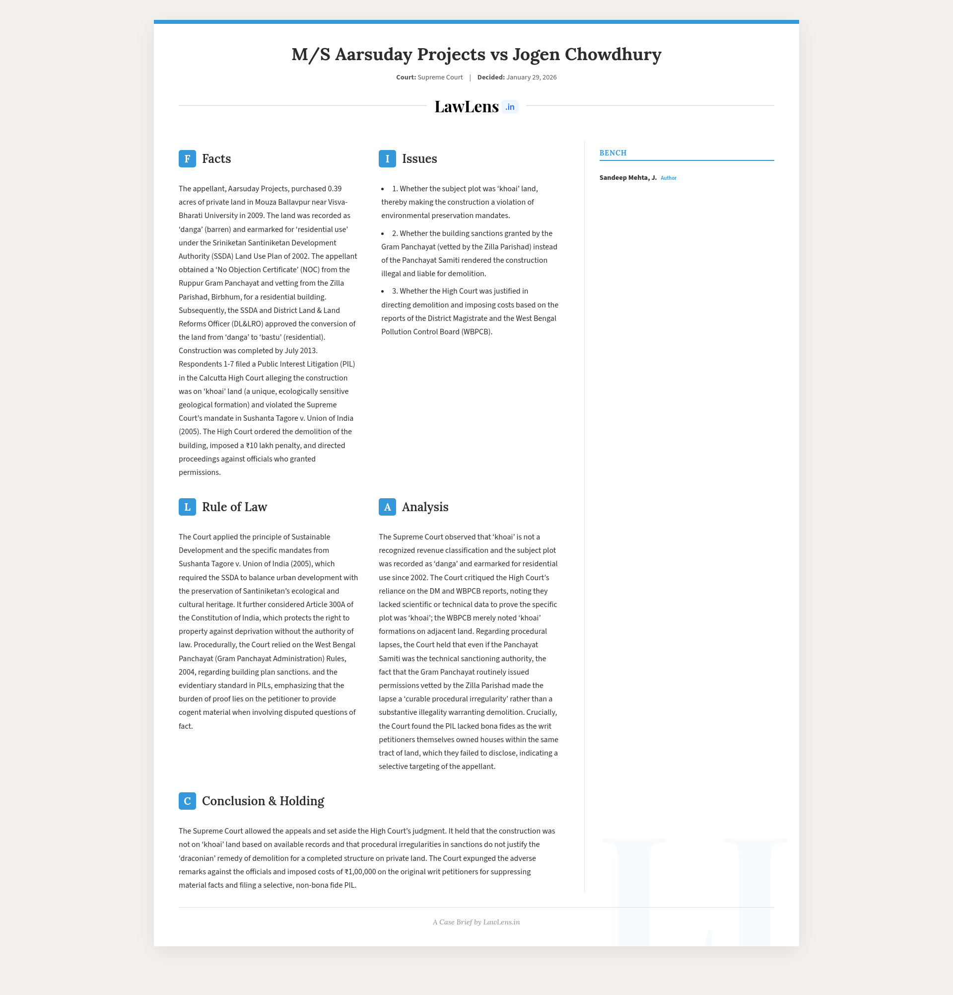 Constitution of India - Article 300A - Any interference with privately owned property, including by way of demolition or deprivation of its beneficial use, must therefore rest on a clear statutory foundation and be preceded by due consideration of all relevant factual and legal circumstances. (Para 41) [Context: The Supreme Court set aside the Calcutta High Court’s order directing demolition of a multi‑storey building constructed by Aarsuday Projects near Visva‑Bharati, holding that there was no clear, scientific or contemporaneous material to show the plot itself was “khoai” land and that the developer had acted on approvals granted by the competent authorities.]