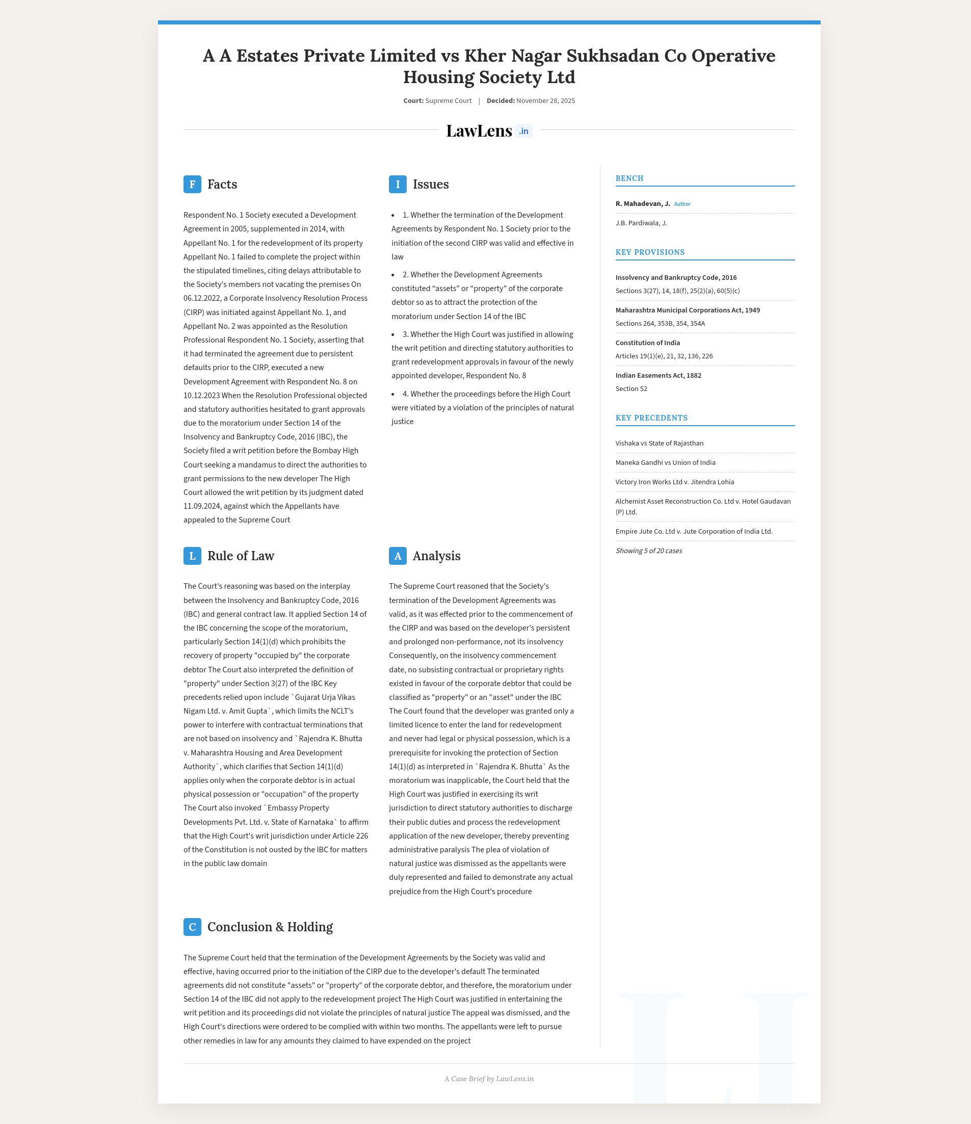 IBC - Section 14 - A defaulting developer cannot invoke the moratorium under Section 14 of the IBC to perpetuate inaction or defeat the legitimate rights of residents. The rights of a developer are purely contingent upon due performance, and no subsisting “asset” or “proprietary right” survives once termination has lawfully occurred. (Para 18.8) A clear distinction must, therefore, be maintained between corporate debtors who have acted bona fide and those who have merely secured development rights in form but never acted in substance. Development rights of a defaulting developer who neither secured possession nor undertook any redevelopment activity cannot be elevated to the status of an “asset” or “property” within the meaning of Section 3(27) of the IBC. (Para 19-20)