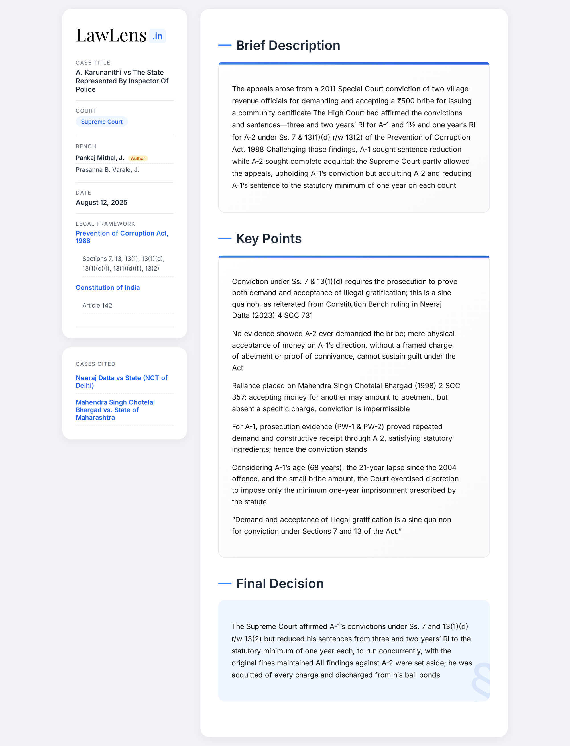 A. Karunanithi vs State 2025 INSC 967 - Prevention of Corruption Act