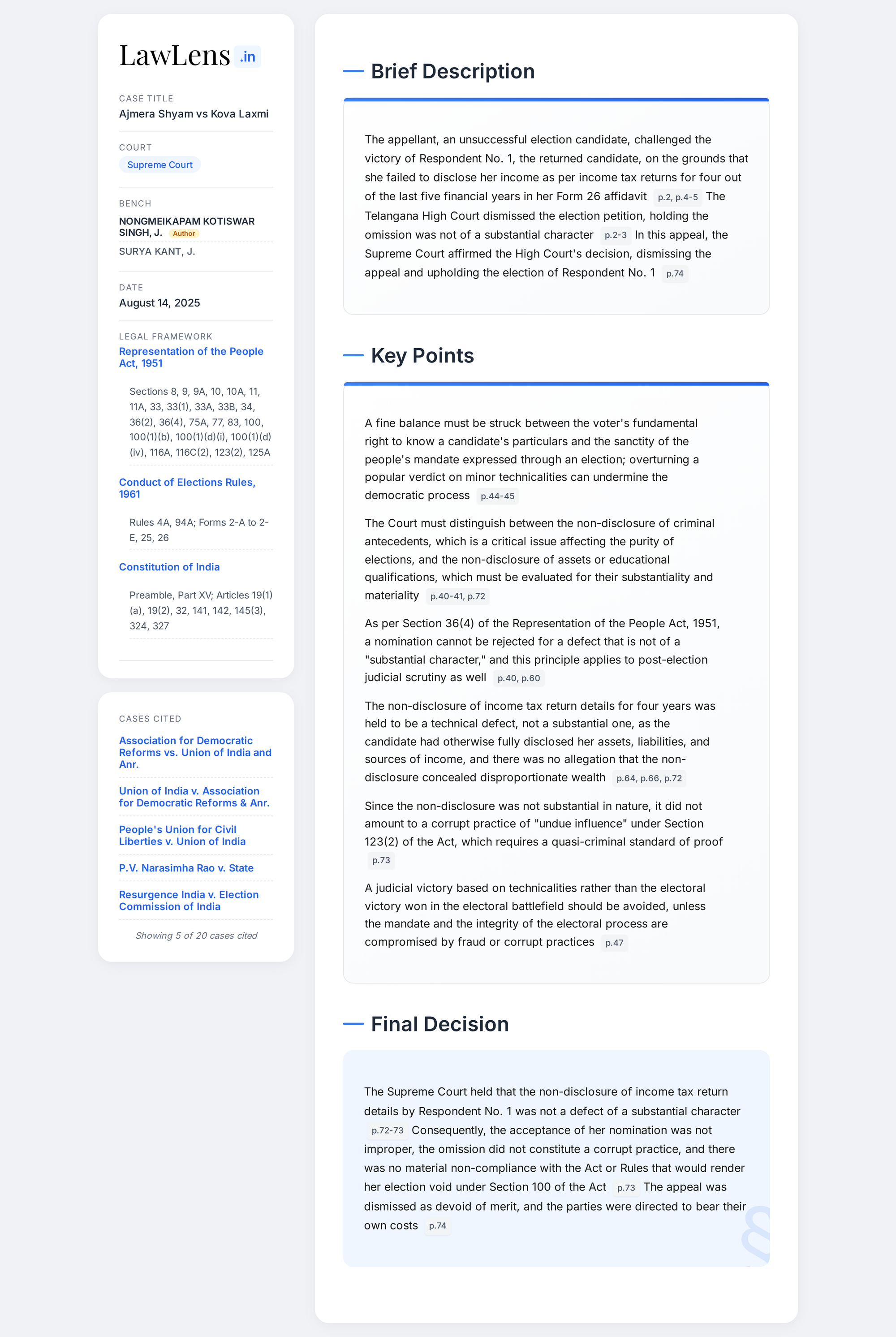 Ajmera Shyam vs Kova Laxmi 2025 INSC 992 - RP Act - Election - Non-Disclosure Of Assets
