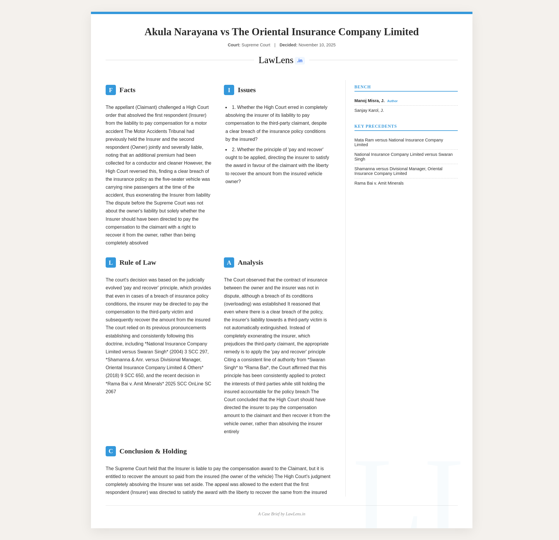 Akula Narayana v. Oriental Insurance Company Limited 2025 INSC 1301 - Motor Accident Compensation - Pay & Recover