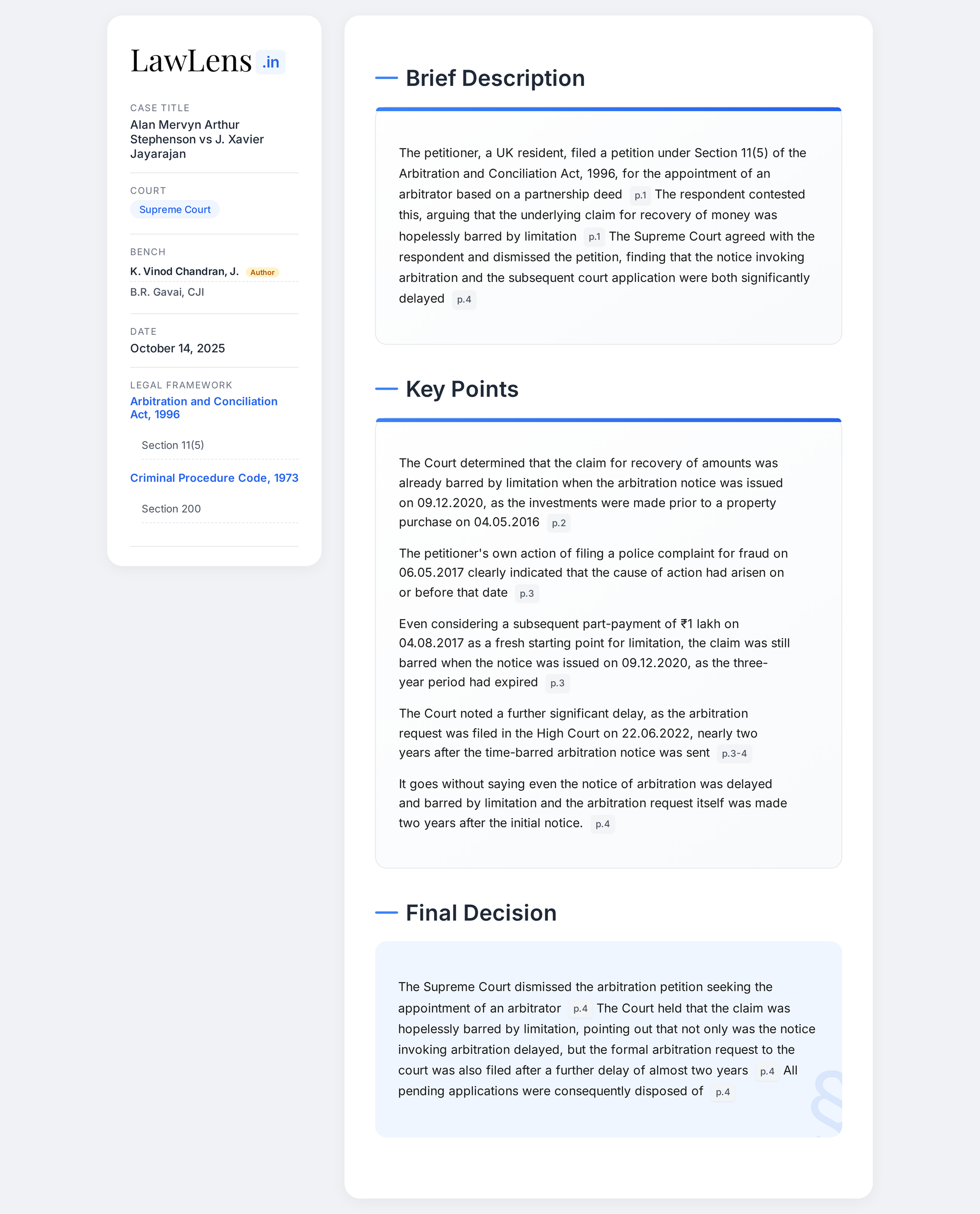 Alan Mervyn Arthur Stephenson v. J. Xavier Jayarajan 2025 INSC 1228 - Arbitration Appointment - Barred By Limitation