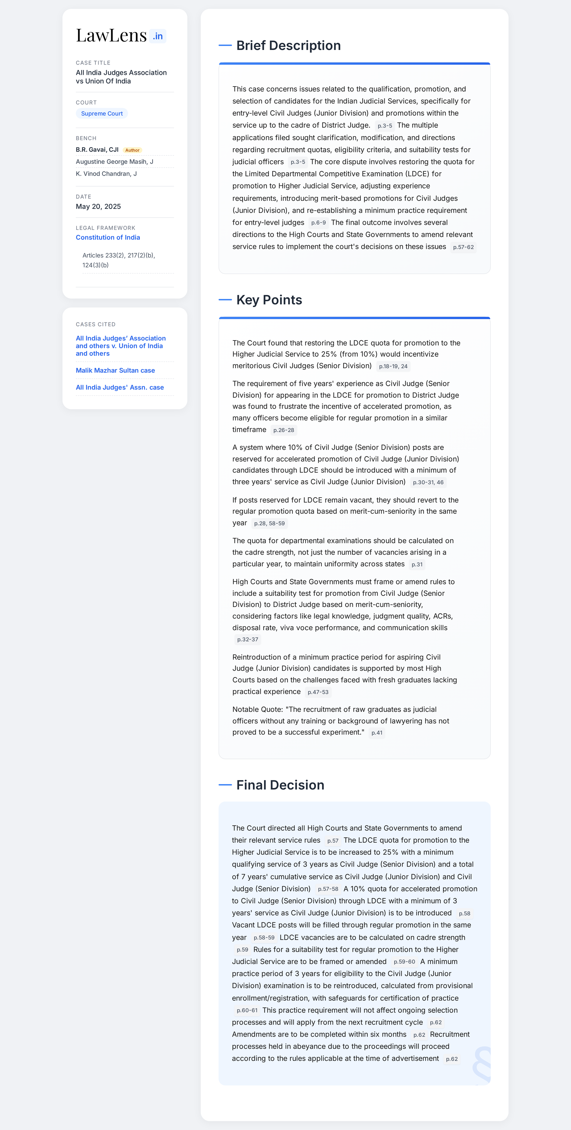 Other Directions issued : (i) All the High Courts and the State Governments in the country shall amend the relevant service Rules to the effect that the quota of reservation for LDCE for promotion from the cadre of Civil Judge (Senior Division) to the Higher Judicial Service is increased to 25%; (ii) All the High Courts and the State Governments in the country shall amend the relevant service rules to the effect that the minimum qualifying service required to appear in the LDCE for promotion from the cadre of Civil Judge (Senior Division) to the Higher Judicial Service be reduced to 3 years’ service as a Civil Judge (Senior Division) and the total service required to be undertaken, including service rendered as a Civil Judge (Junior Division) and Civil Judge (Senior Division), be set at a minimum of 7 years’ service; (iii) All the High Courts and the State Governments in the country shall amend the relevant service rules to the effect that 10% of the posts in the Cadre of Civil Judge (Senior Division) be reserved for accelerated promotion of Civil Judge (Junior Division) candidates through LDCE mechanism. The minimum qualifying service required for appearing in the said LDCE shall be three years’ service as Civil Judge (Junior Division); (iv) Needless to state that if any post reserved for LDCE for either Civil Judge (Senior Division) or for the Higher Judiciary remains vacant, the same shall be filled through regular promotion on the basis of ‘merit-cum-seniority’ in that particular year. Filling up of the vacant posts in the ratio considered for LDCE will have to be carried out from the simultaneous selection process carried out for regular promotions of the same year; (v) The High Courts and the Governments of the States where the vacancies for the LDCE are not being calculated based on the cadre strength shall amend the relevant service rules to the effect that the vacancies for LDCE be calculated on the basis of cadre strength; (vi) All the High Courts and the State Governments in the country where the Rules are not framed or if they are framed but are not adequate to judge the suitability of a candidate for being promoted to the Cadre of Higher Judicial Service from the Cadre of Civil Judge (Senior Division) shall frame fresh Rules or amend the existing Rules keeping in mind various factors like: (i) whether the candidate possesses updated knowledge of law; (ii) the quality of judgments rendered by the Judicial Officer; (iii) ACRs of the Judicial Officer of the preceding five years; (iv) disposal rate in the preceding five years; (v) performance of the Judicial Officer in the viva voce; and (vi) general perceptions and awareness as also communication skills; (vii) All the High Courts and the State Governments in the country shall amend the relevant service rules to the effect that candidates desirous of appearing in the examination for the post of Civil Judge (Junior Division) must have practiced for a minimum period of 3 years to be eligible for the said examination. To fulfill the said requirement, the Rules shall mandate that the candidate produces a certificate to that effect duly certified either by the Principal Judicial Officer of that Court or by an advocate of that Court having a minimum standing of 10 years duly endorsed by the Principal Judicial Officer of such a District or a Principal Judicial Officer at such a station. Insofar as the candidates who are practicing before the High Courts or this Court, they shall be certified by an advocate who has a minimum standing of 10 years duly endorsed by an officer designated by that High Court or this Court. We further direct that the experience of the candidates which they have gained while working as Law Clerks with any of the Judges or Judicial Officers in the country should also be considered while calculating their total number of years of practice. The Rules shall also mandate that the candidates who are appointed to the post of Civil Judge (Junior Division) pursuant to their selection through the examination must compulsorily undergo at least 1 year of training before presiding in a Court; (viii) It is directed that the number of years of practice completed by a candidate desirous of appearing in the examination for the post of Civil Judge (Junior Division) be calculated from the date of their provisional enrolment/registration with the concerned State Bar Council; (ix) It is further directed that the said requirement of minimum years of practice shall not be applicable in cases where the concerned High Court has already initiated the selection process for the post of Civil Judge (Junior Division) prior to the date of this judgment and shall be applicable only from the next recruitment process; and (x) All the amendments in terms of the aforesaid directions shall be carried out by the High Courts within a period of three months from the date of this judgment and the concerned State Governments shall consider and approve the same within a further period of three months.