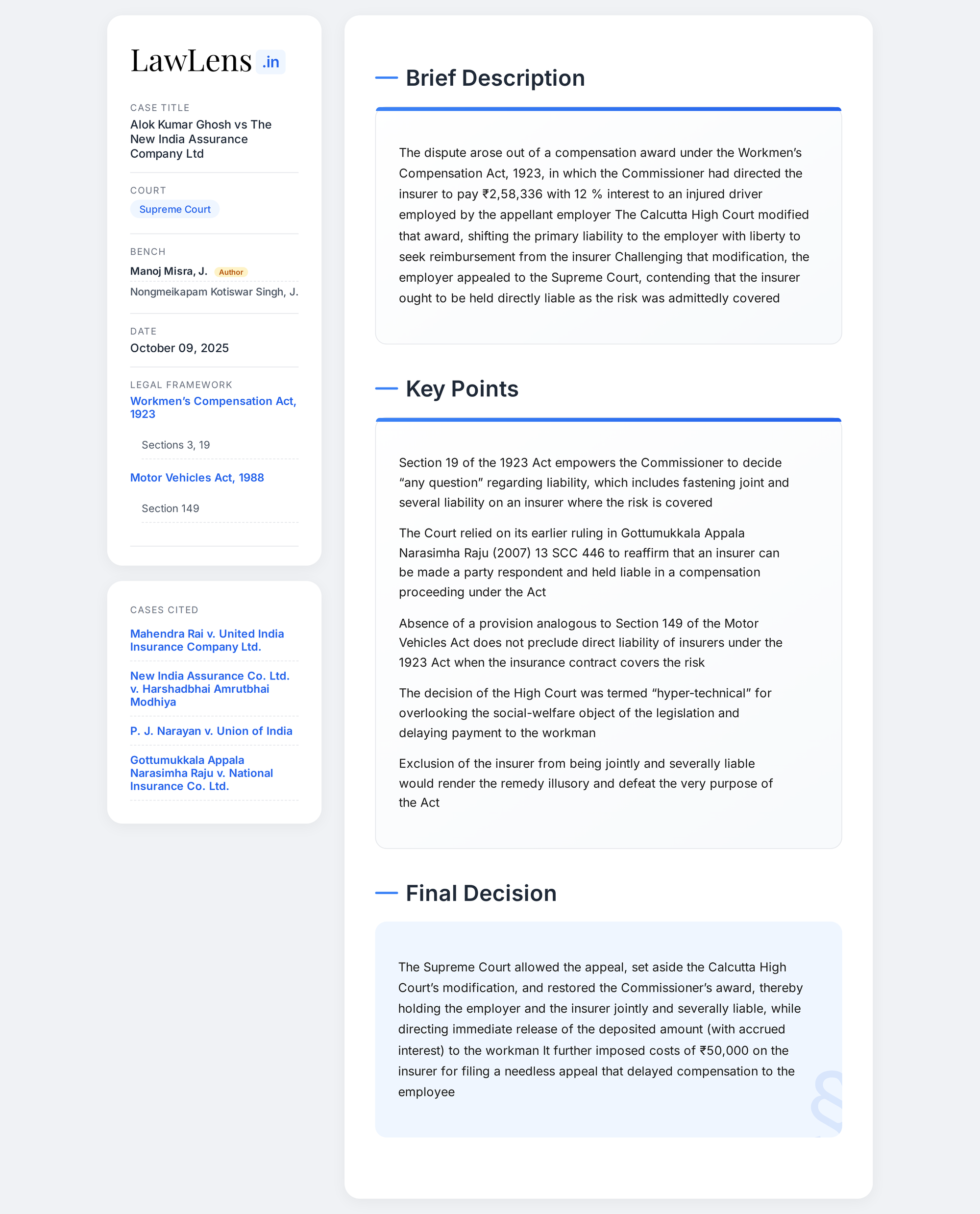 Alok Kumar Ghosh vs New India Assurance Company Ltd; 2025 INSC 1239 - Employee’s Compensation Act - Insurer As Party Respondent