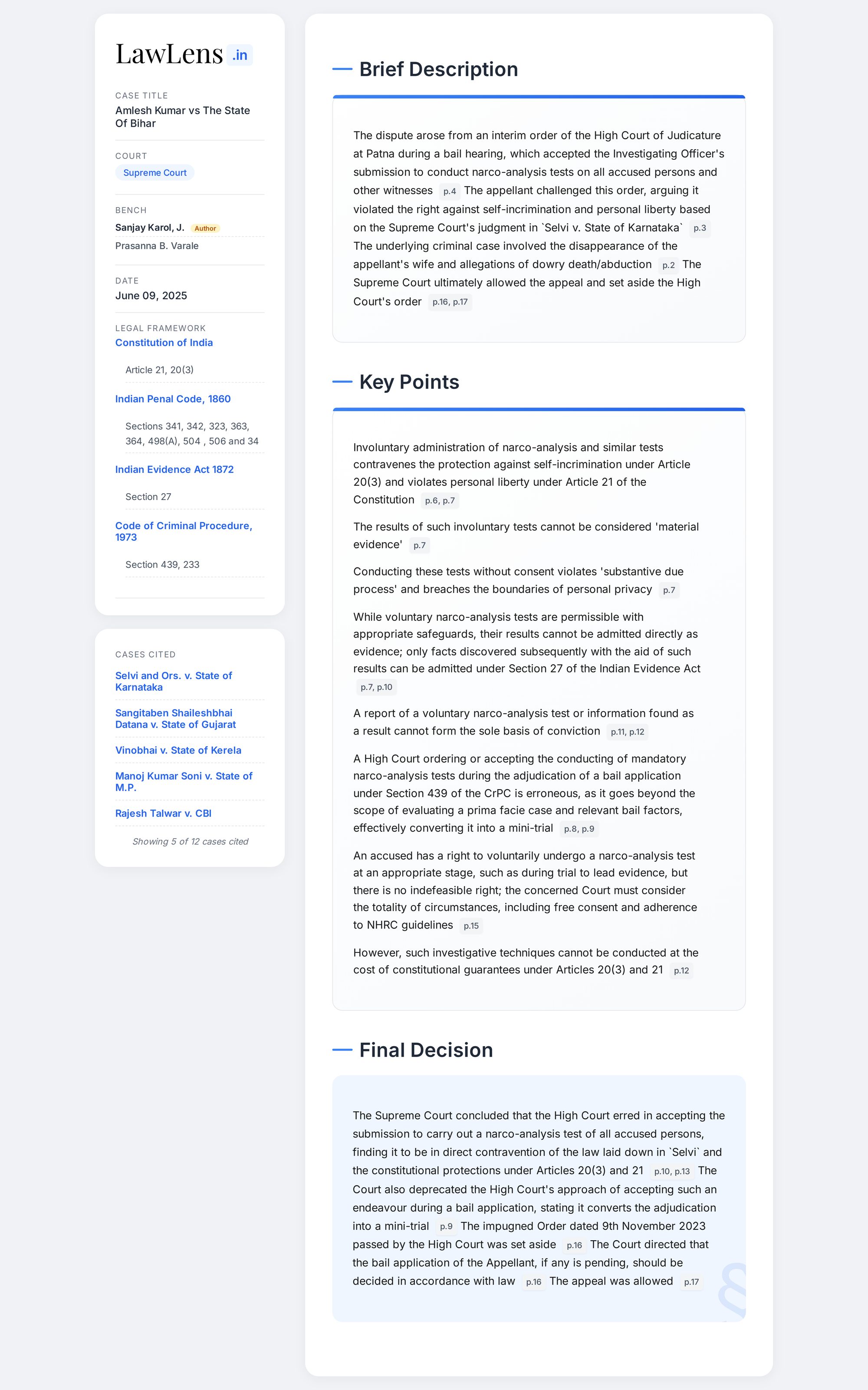 Amlesh Kumar vs State Of Bihar 2025 INSC 810 - Accused’s Right To Voluntarily Undergo Narco Analysis Test