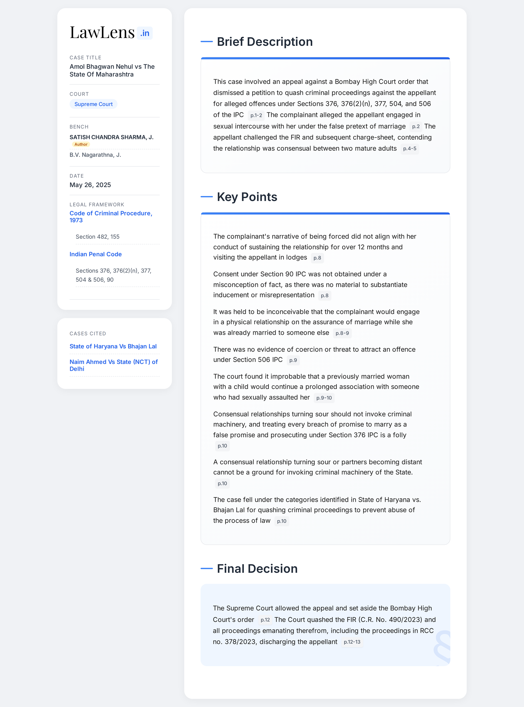 Amol Bhagwan Nehul vs State Of Maharashtra 2025 INSC 782- S.376 IPC - Rape- False Promise To Marry