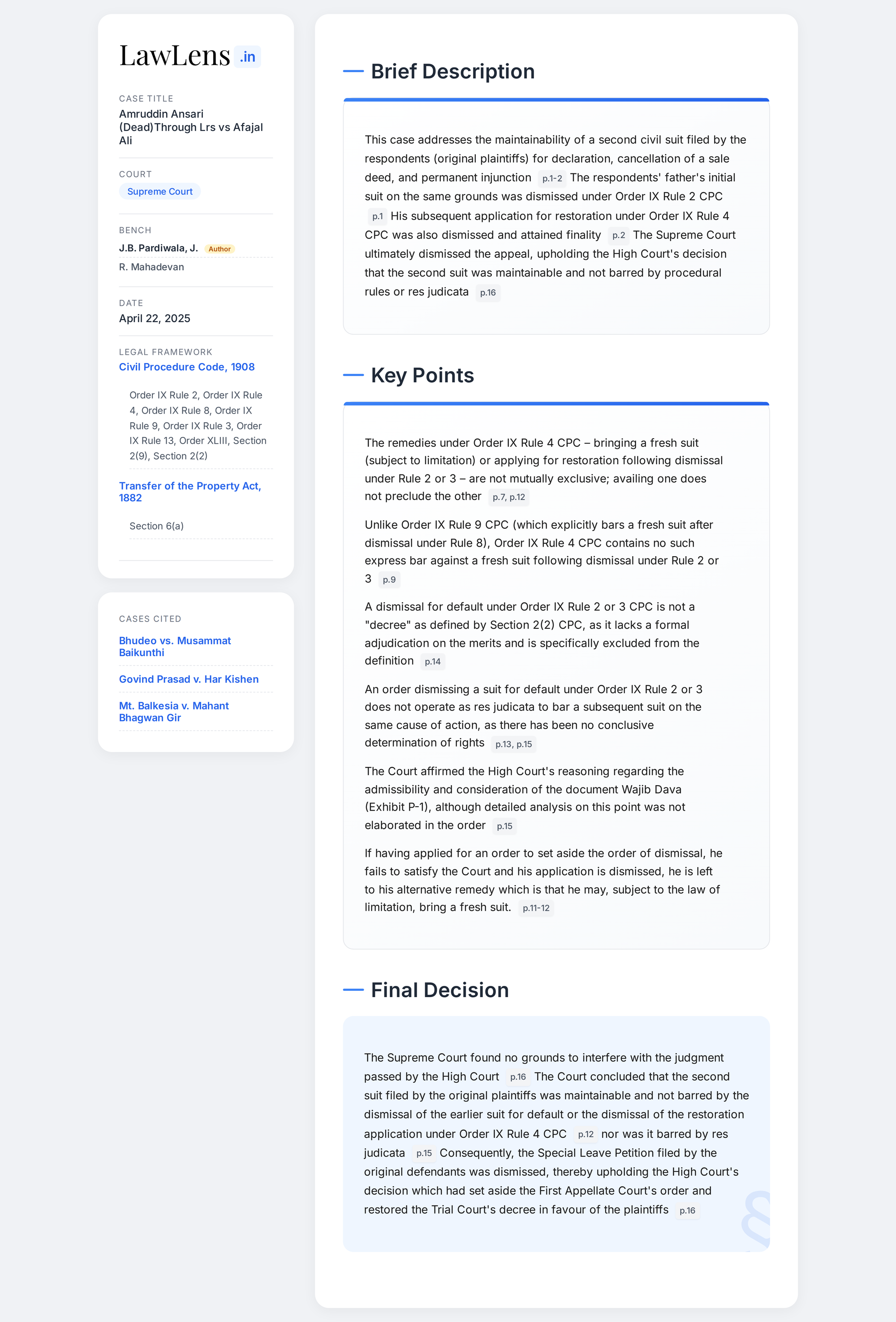 Amruddin Ansari (D) vs Afajal Ali 2025 INSC 566 -CPC - Fresh Suit After Dismissal For Default
