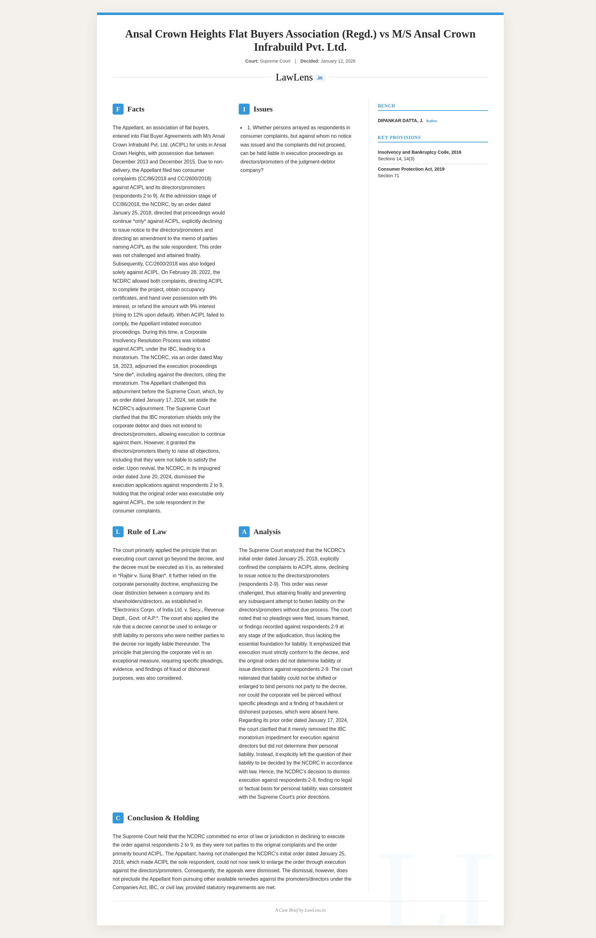 Ansal Crown Heights Flat Buyers Association v. Ansal Crown Infrabuild Pvt. Ltd. - 2026 INSC 51. Consumer Protection Act - Companies Act - IBC
