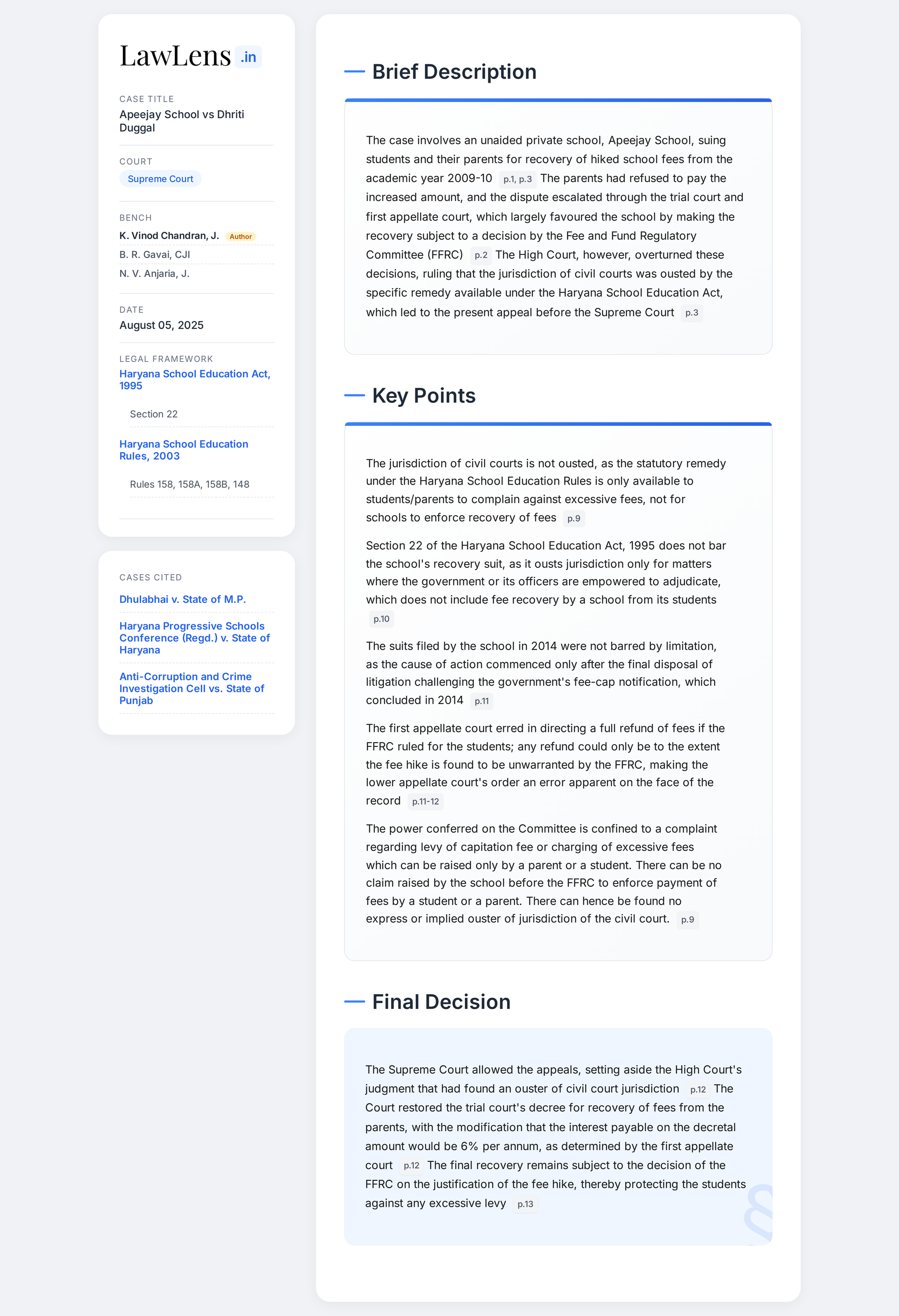 Apeejay School vs Dhriti Duggal 2025 INSC 925 - Haryana School Education Act - Civil Court Jurisdiction - Recovery Of Fee
