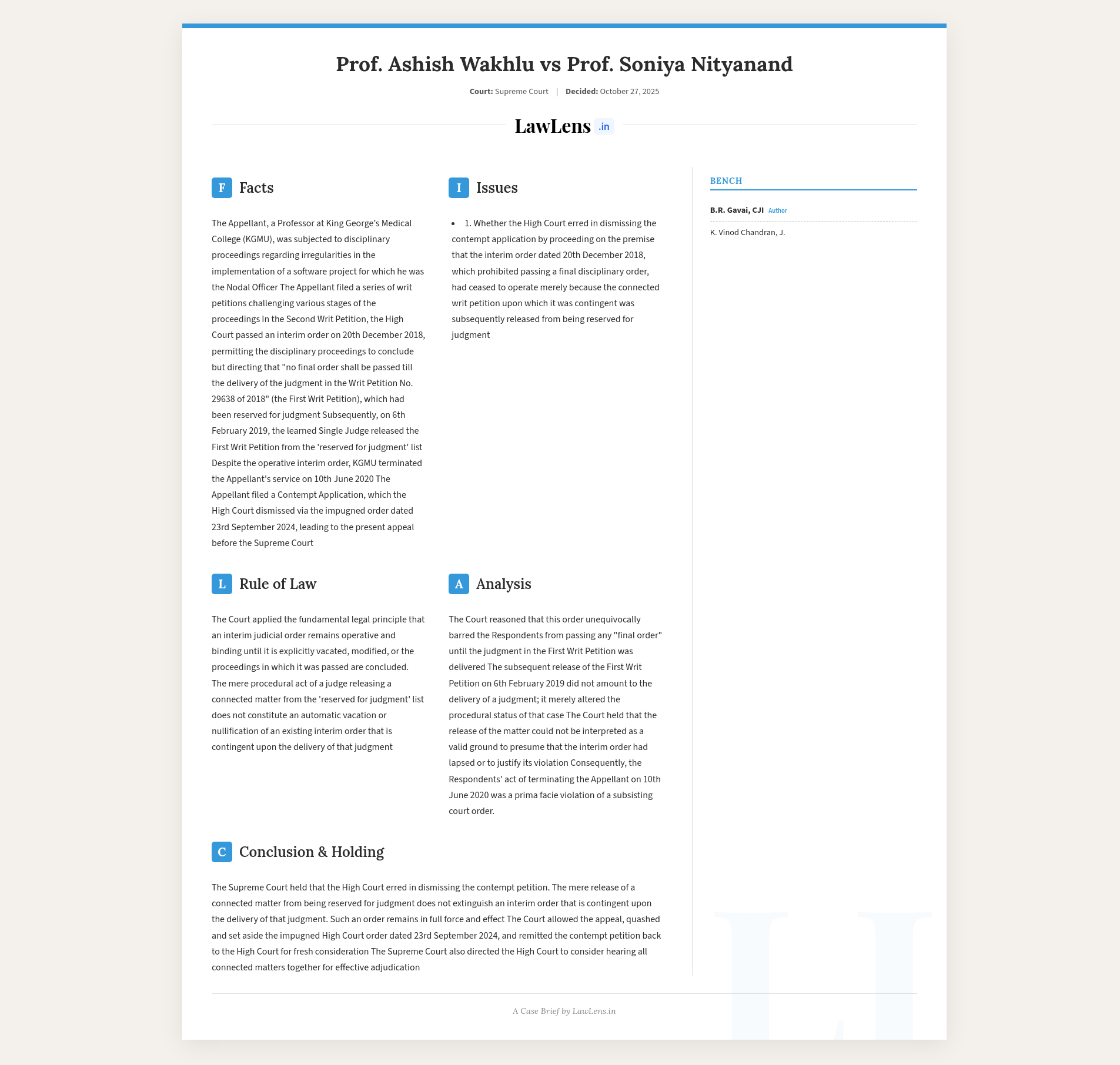 - Case name: Prof. Ashish Wakhlu vs Prof. Soniya Nityanand and Others.