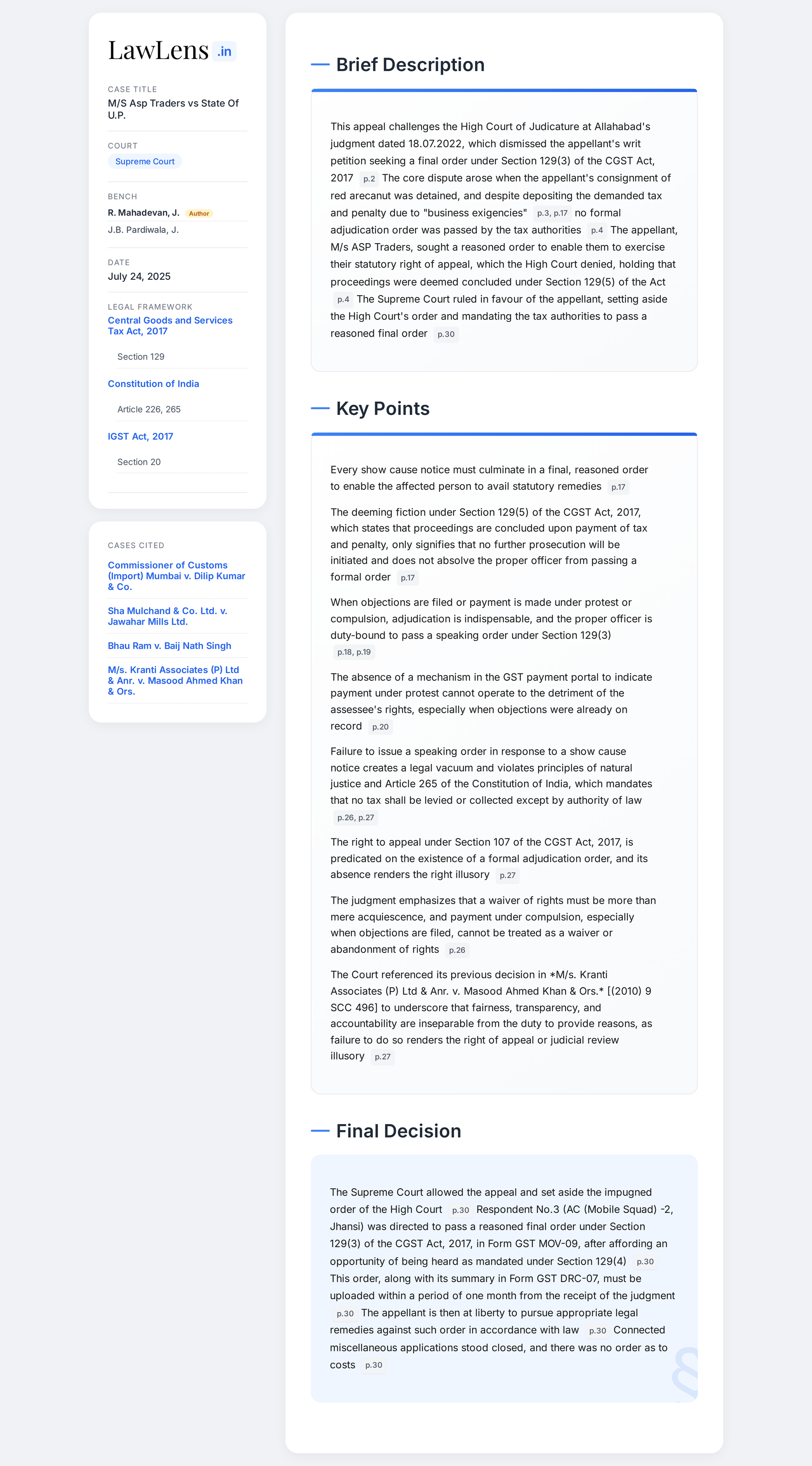 ASP Traders vs. State of Uttar Pradesh 2025 INSC 890 - S.129 CGST Act