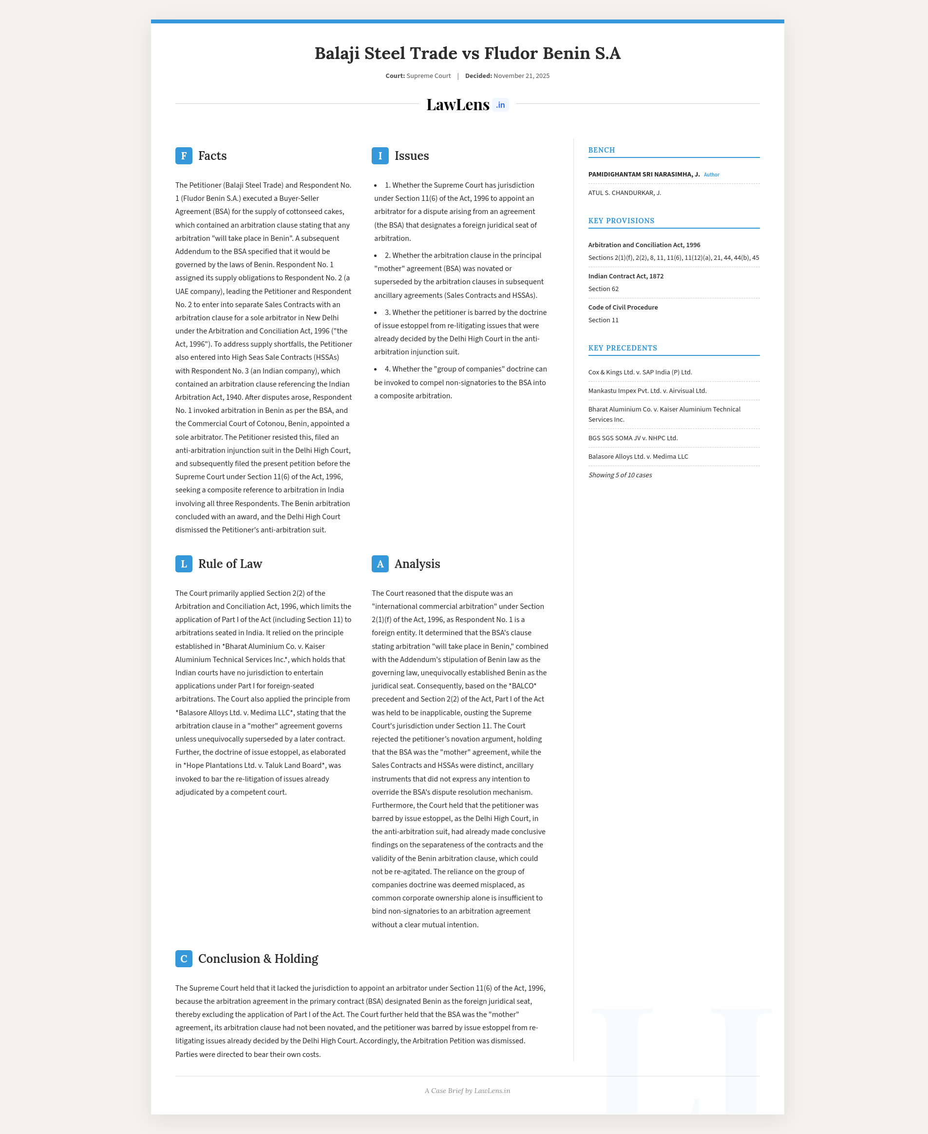 Balaji Steel Trade v. Fludor Benin S.A 2025 INSC 1342 - Arbitration Act - Foreign Seated Arbitration