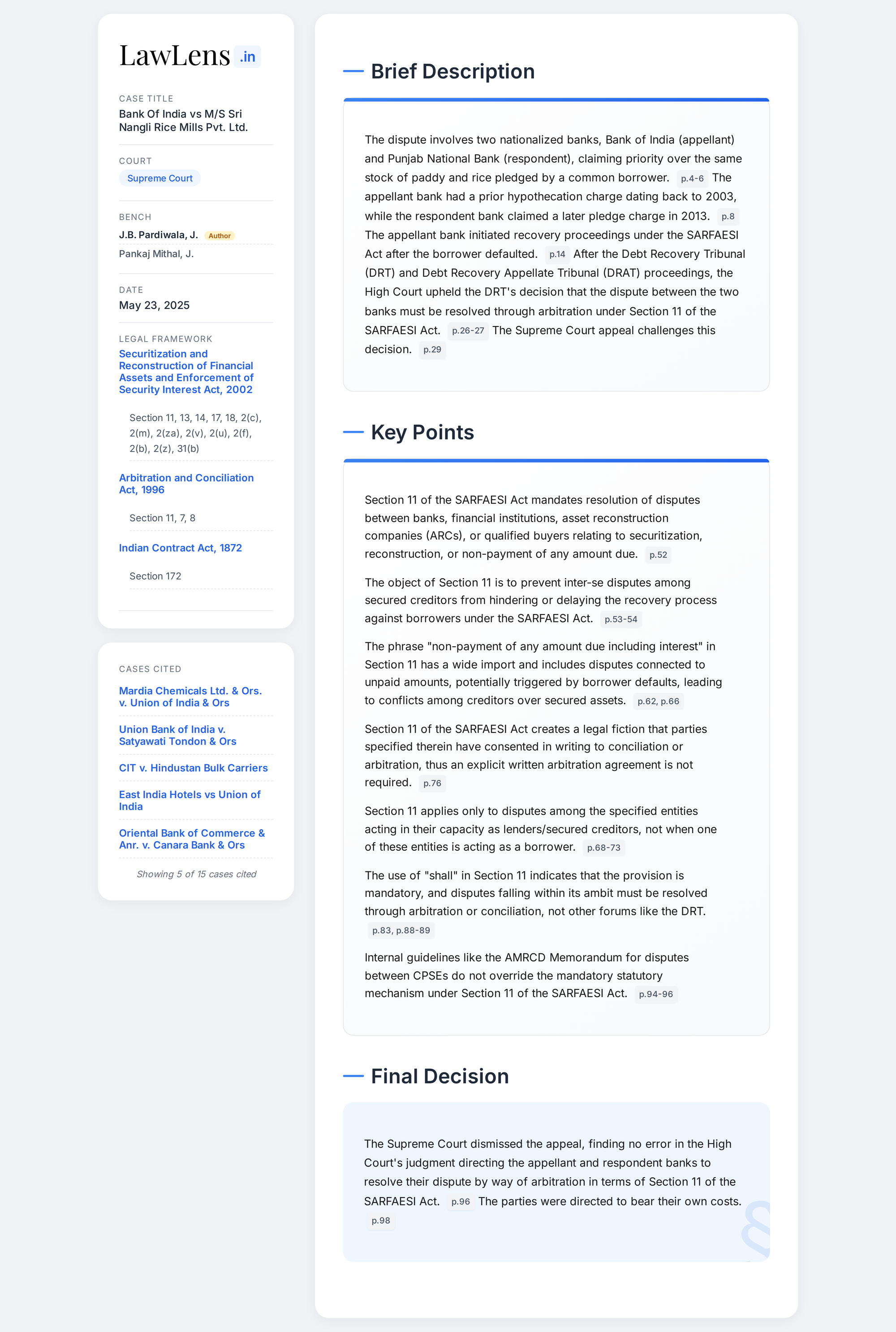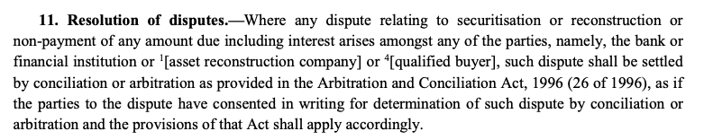 Section 11 of the SARFAESI Act, provides for a statutory arbitration for any dispute mentioned therein between any of the parties enumerated thereunder. There is no need for an explicit written agreement to arbitrate between such parties in order to attract Section 11 of the SARFAESI Act. The said provision creates a legal fiction as regards the existence of an arbitration agreement notwithstanding whether such agreement exists or not in actuality. (Para 124-I,V)
