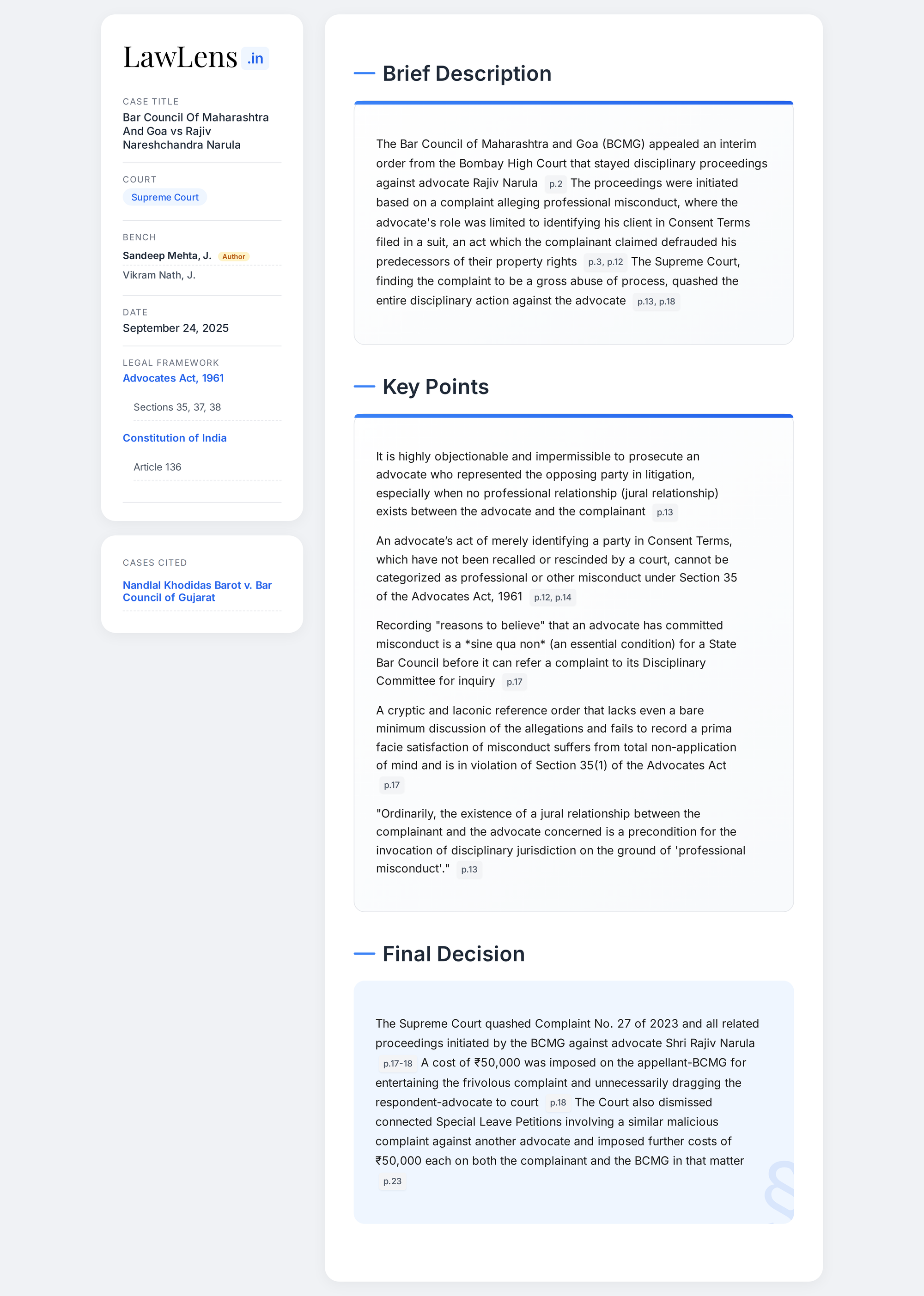 Bar Council Of Maharashtra And Goa vs Rajiv Nareshchandra Narula 2025 INSC 1147 - Advocates Act - Disciplinary Committee