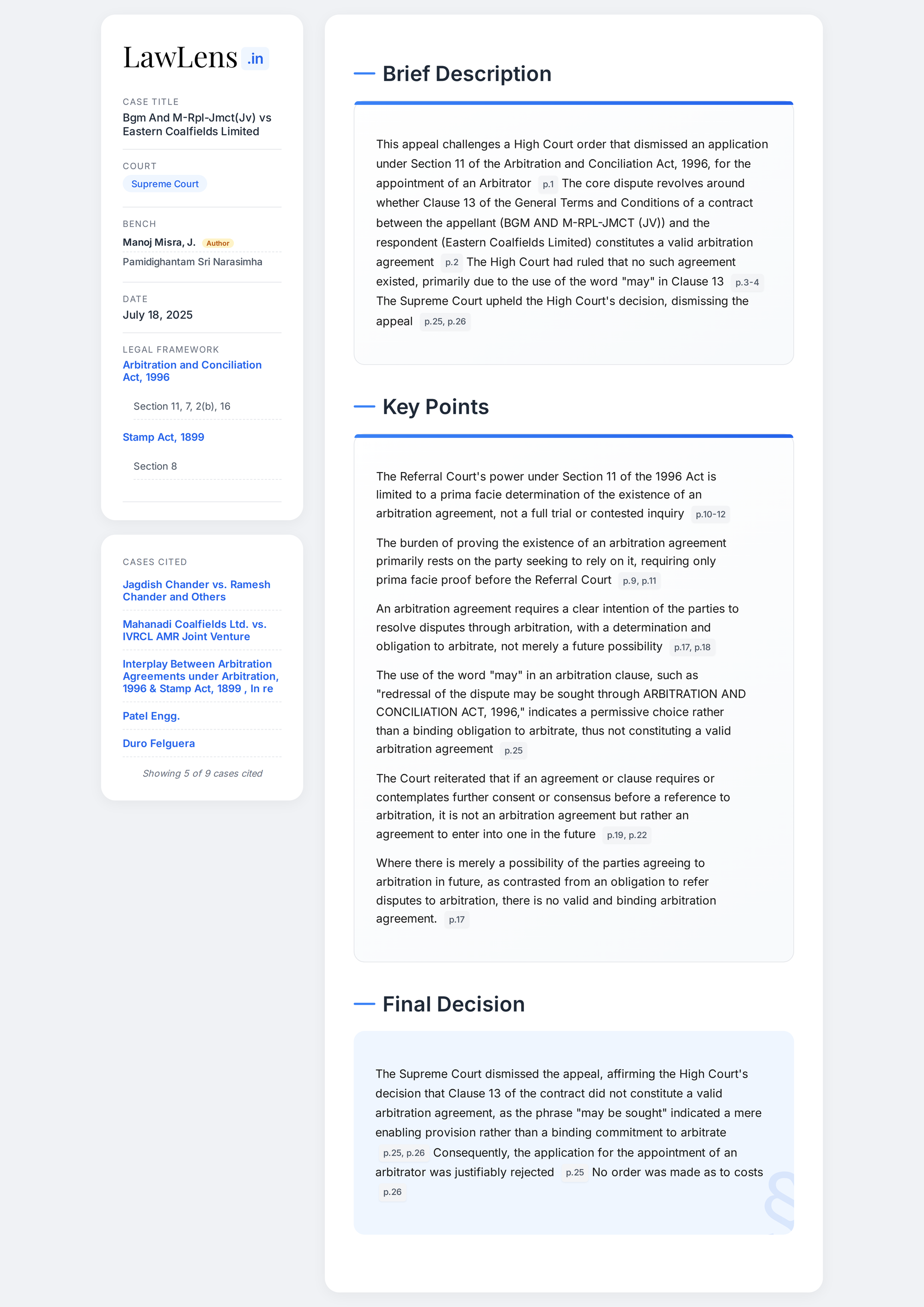 BGM and M-RPL-JMCT (JV) vs Eastern Coalfields Limited 2025 INSC 874 - Arbitration Agreement - Reference