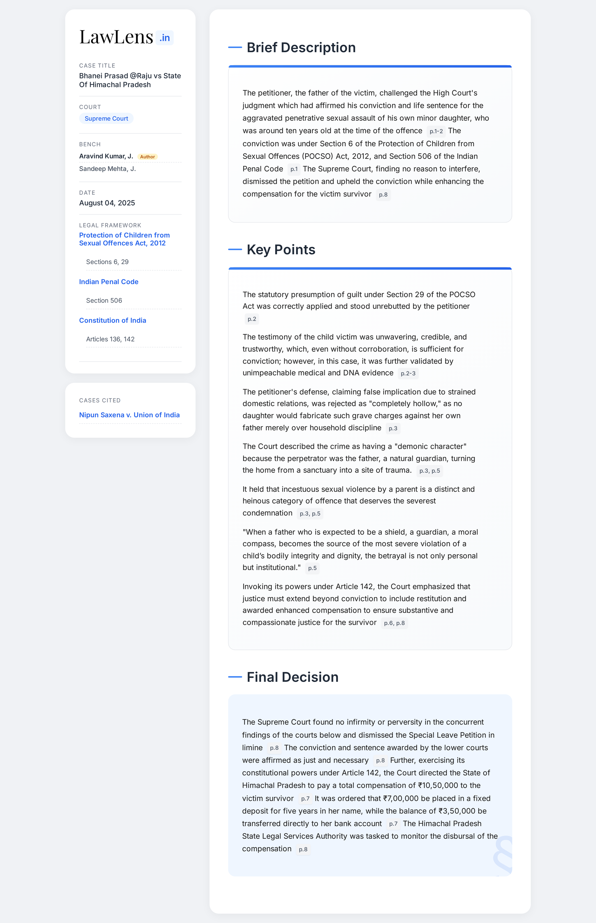Bhanei Prasad @ Raju vs State of Himachal Pradesh 2025 INSC 934 - POCSO Act - Restitution