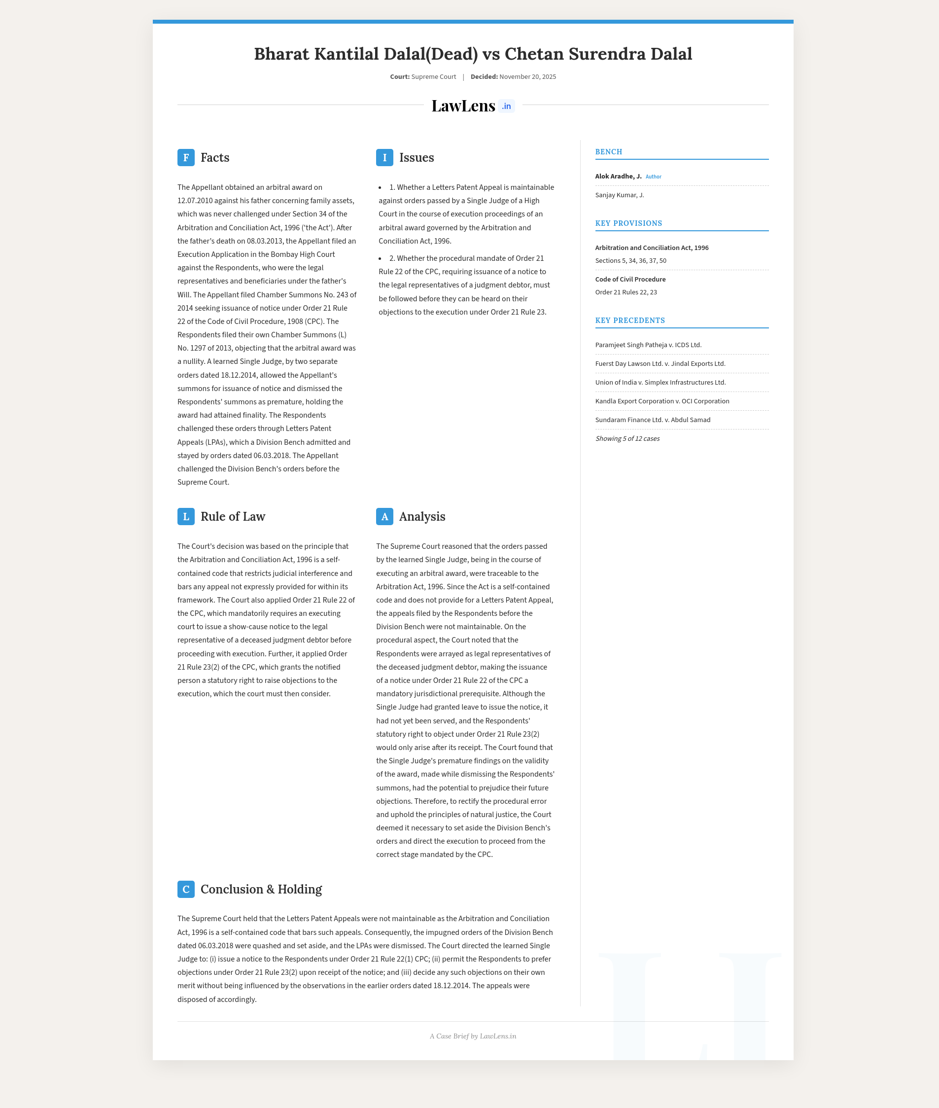 - Case name: Bharat Kantilal Dalal (Dead) Through LR v. Chetan Surendra Dalal & Ors.