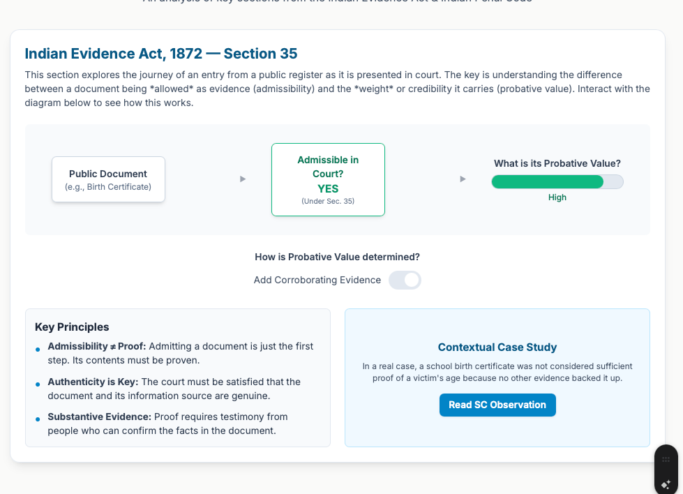Indian Evidence Act 1872 - Section 35 - The evidentiary value of such an entry made in public or official registers may be admissible in evidence under Section 35 of the Indian Evidence Act, 18727. However, admissibility is distinct from probative value. While such documents may be admitted into evidence, their evidentiary weight depends on proof of their authenticity and the source of the underlying information. Mere production and marking of a document as exhibited by the Court does not amount to proof of its contents. Its execution has to be proved by leading substantive evidence, that is, by the ‘evidence of those persons who can vouchsafe for the truth of the facts in issue' (para 8) [Context: In this case, prosecution relied on birth certificate issued by a school to establish that the victim was below the age of sixteen years on the date of the alleged offence - SC observed: here is nothing on record to corroborate the date of birth of the victim as recorded in the birth certificate (Ex.P11) issued by the school. Therefore, it cannot be relied upon to definitely determine the age of the victim and held with certainty that the victim was below sixteen/eighteen years of age.