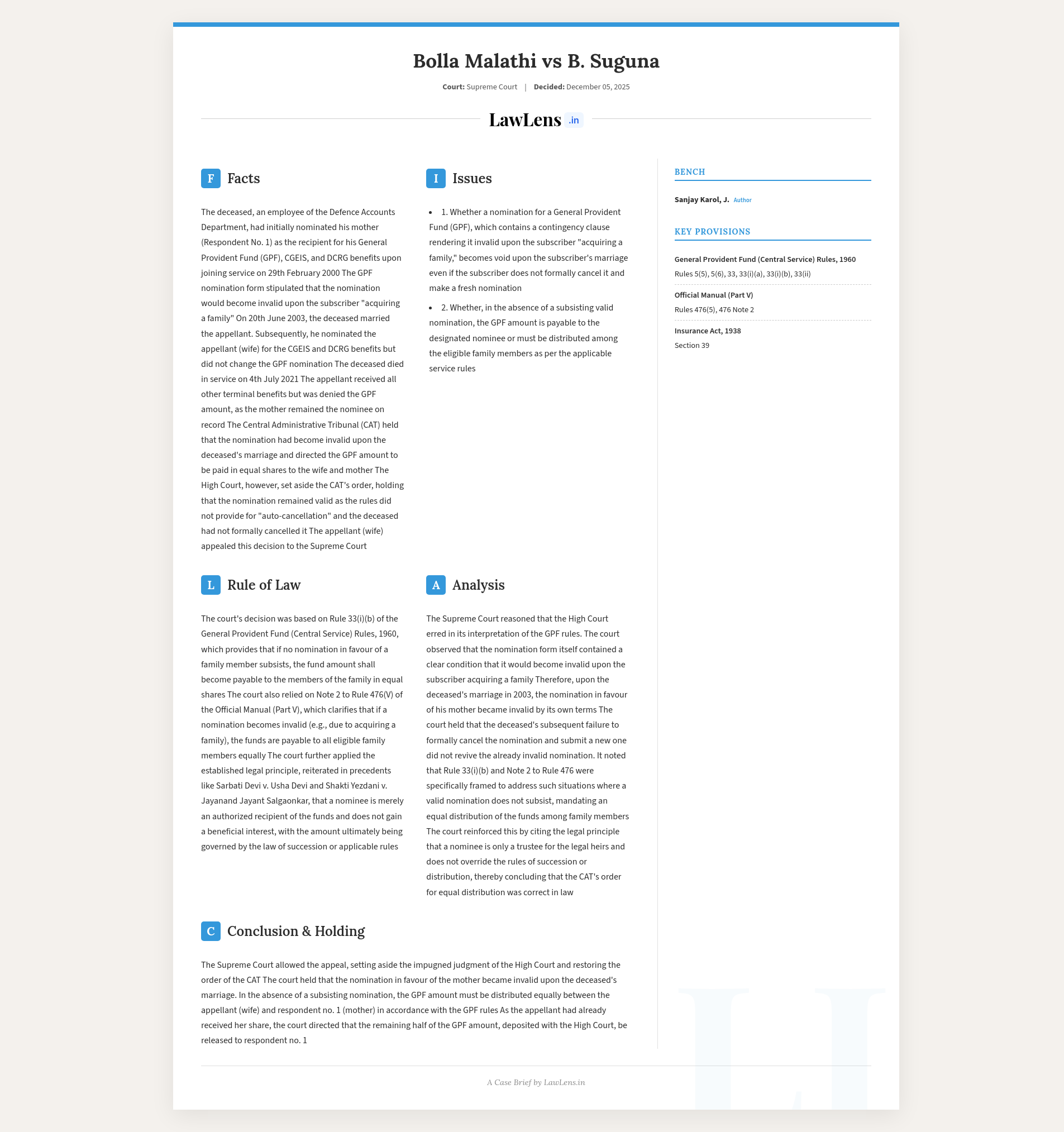 Bolla Malathi vs B. Suguna, 2025 INSC 1391 - Nomination - General Provident Fund (Central Service) Rules