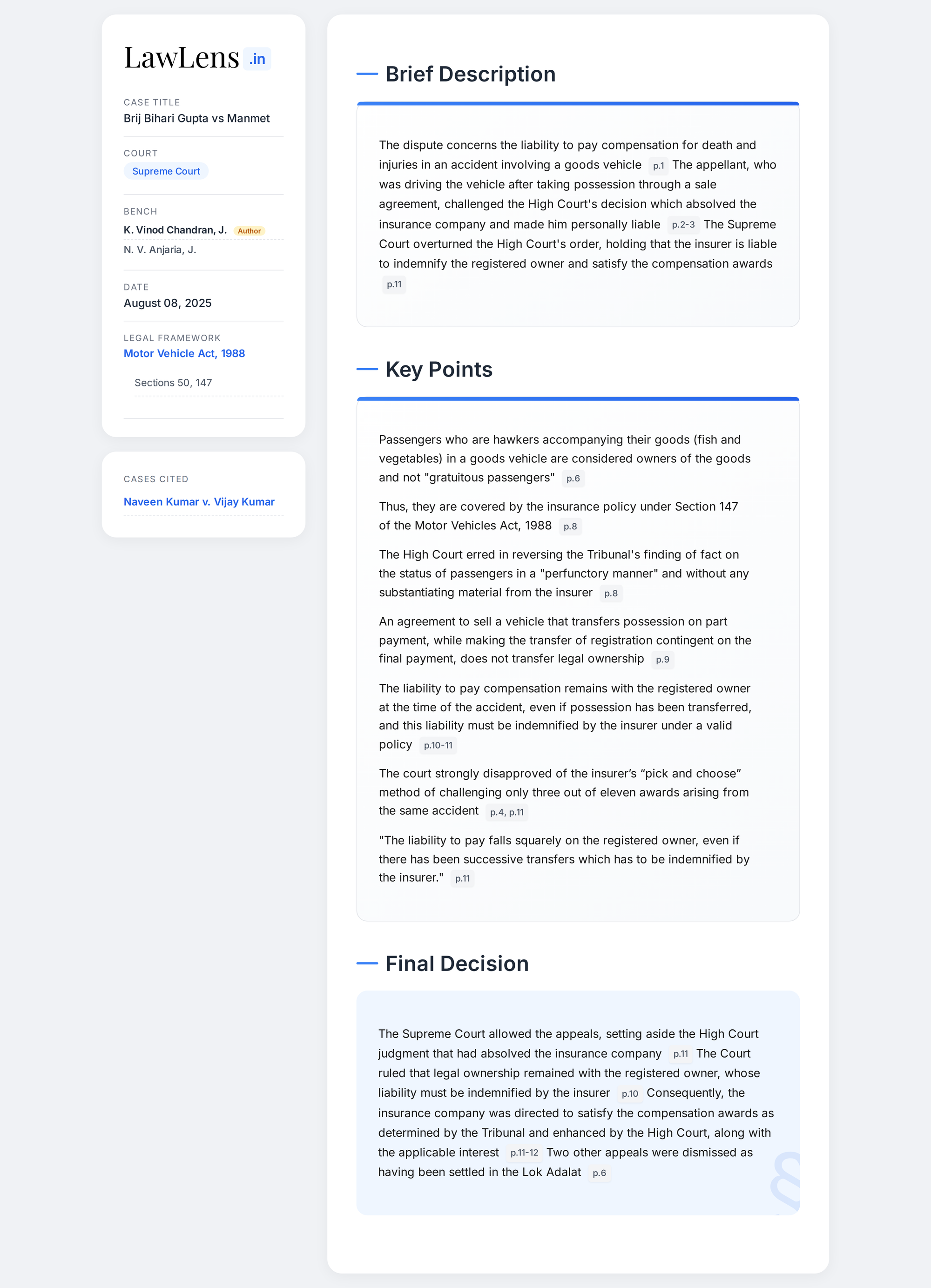 Brij Bihari Gupta vs. Manmet 2025 INSC 948 - Motor Accident Compensation -Registered Owner Liability