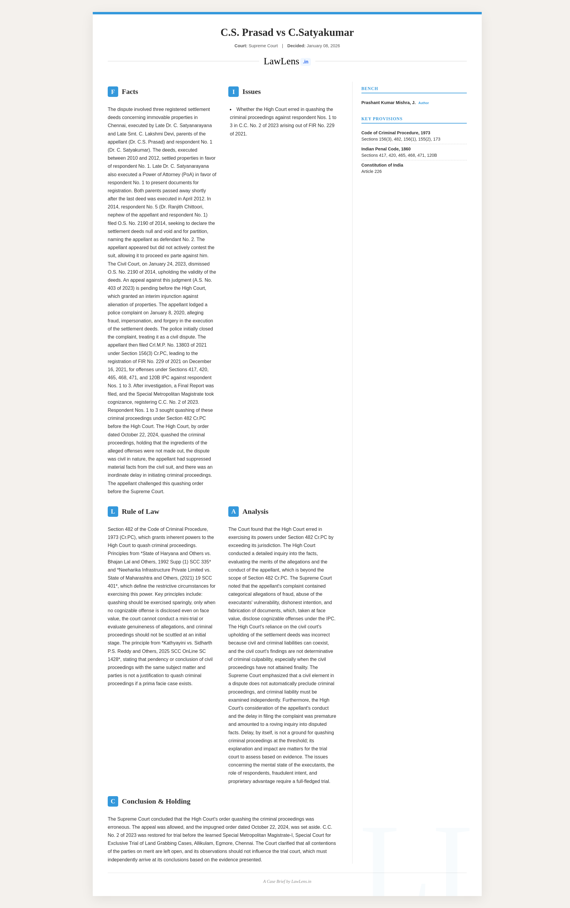C.S. Prasad vs C. Satyakumar and Others; 2026 INSC 39 - S.482 CrPC - Quashing - Civil Suit - Delay