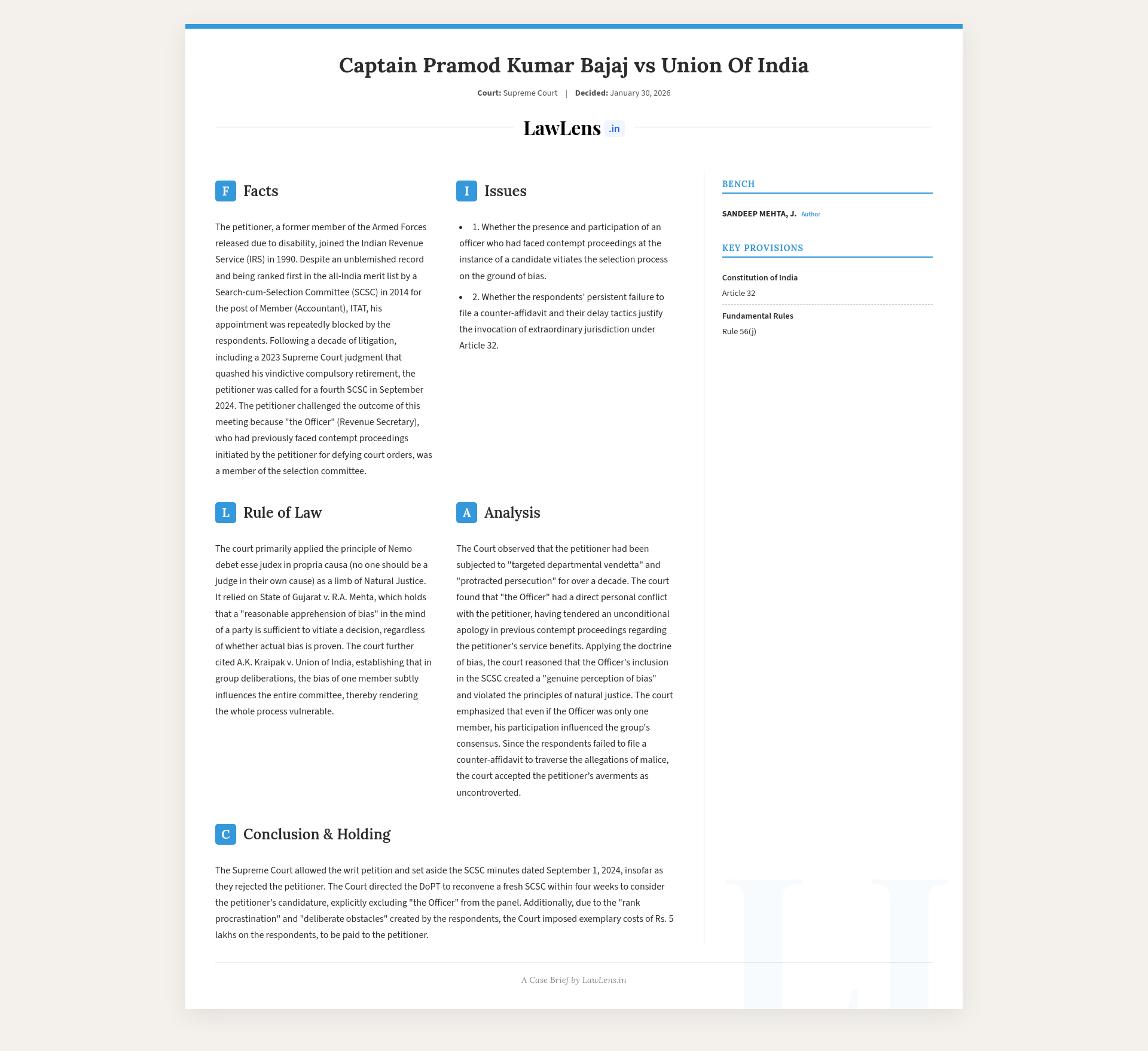 Captain Pramod Kumar Bajaj v. Union of India 2026 INSC 101 - Public Appointment - Rule Against Bias
