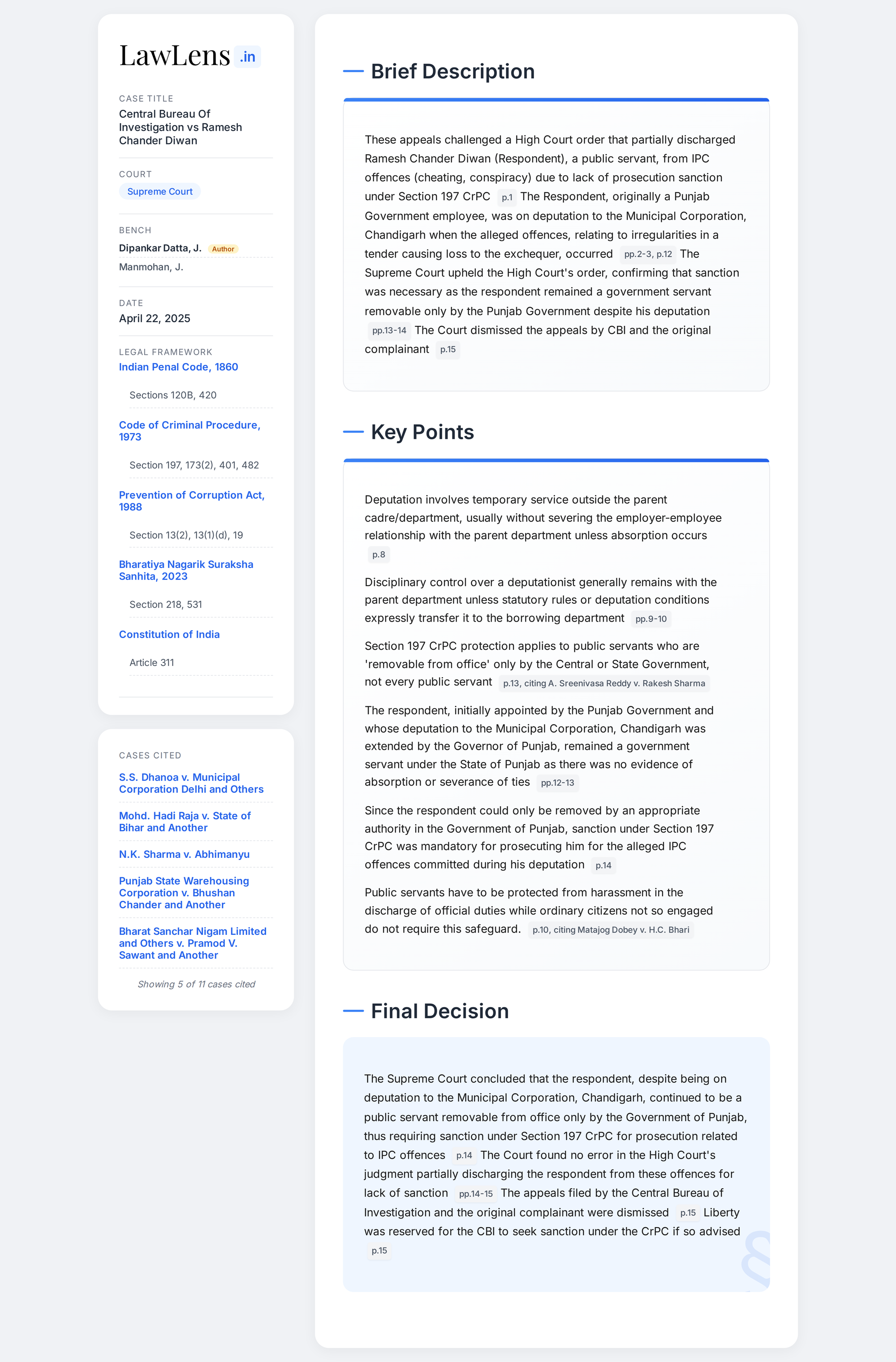 Central Bureau Of Investigation vs Ramesh Chander Diwan 2025 INSC 539 -S. 197 CrPC - Deputation