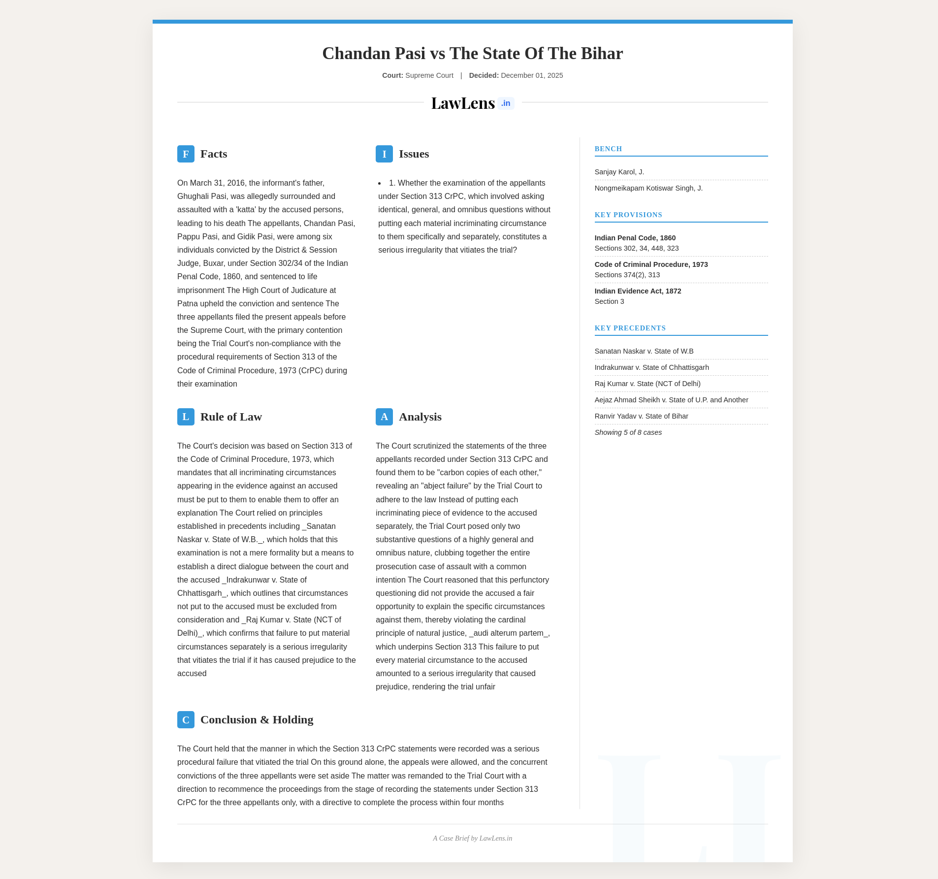 Chandan Pasi & Ors. v. State of Bihar; 2025 INSC 1371 - Criminal Trial - S.313 CrPC - Public Prosecutor