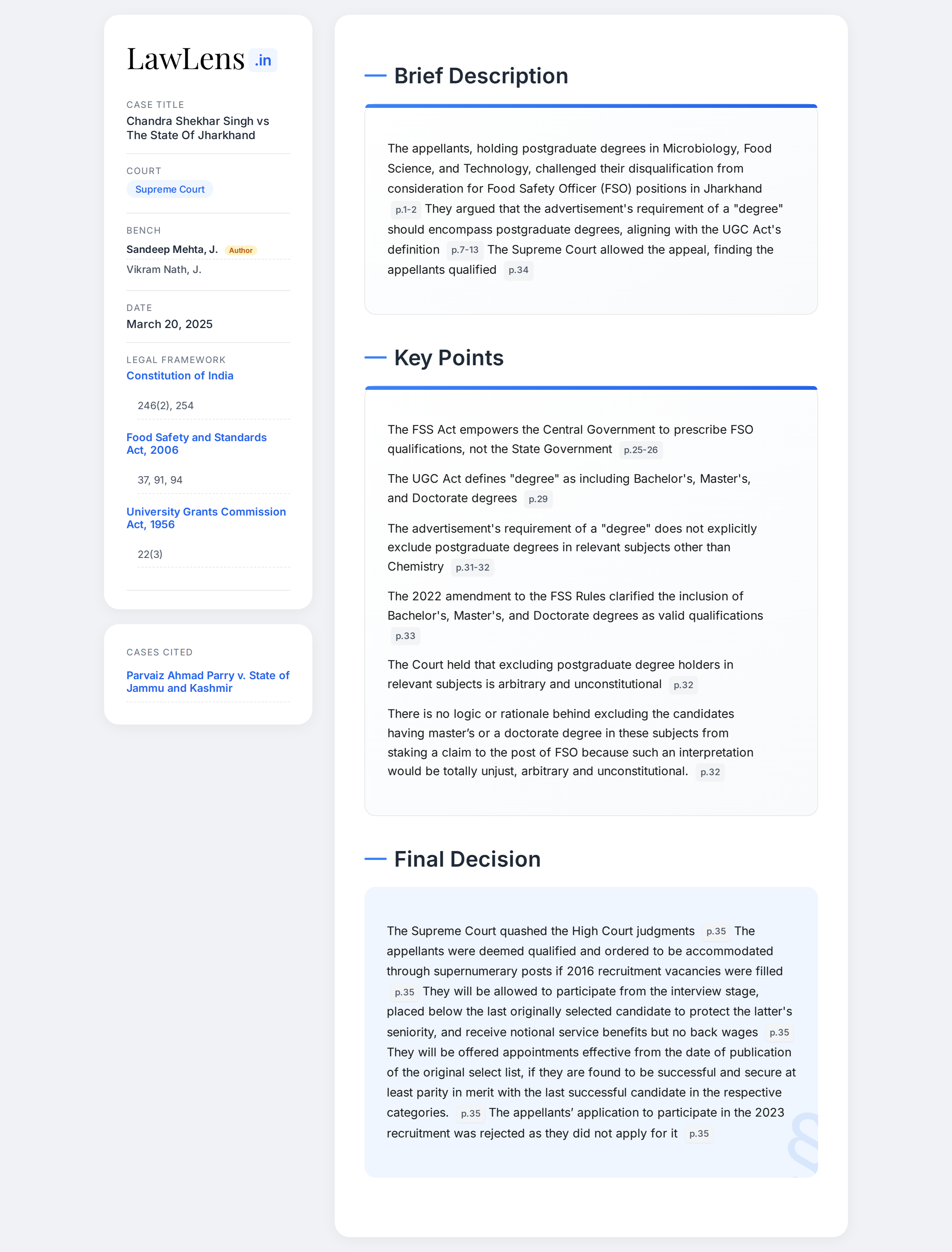 Food Safety and Standard Rules, 2011- If a candidate, having undertaken a degree course in “Chemistry” subject, desires to apply for the post of FSO, he must possess a master’s degree in that subject. However, if a candidate has taken college education in the subjects of food technology; dairy technology; biotechnology; oil technology; agricultural science; veterinary science; biochemistry or microbiology, then such a candidate would be qualified for the FSO post, if he holds any one of the degrees, i.e., either graduation, post-graduation or doctorate degree in any of these subjects. There is no logic or rationale behind excluding the candidates having master’s or a doctorate degree in these subjects from staking a claim to the post of FSO because such an interpretation would be totally unjust, arbitrary and unconstitutional. (para 32)