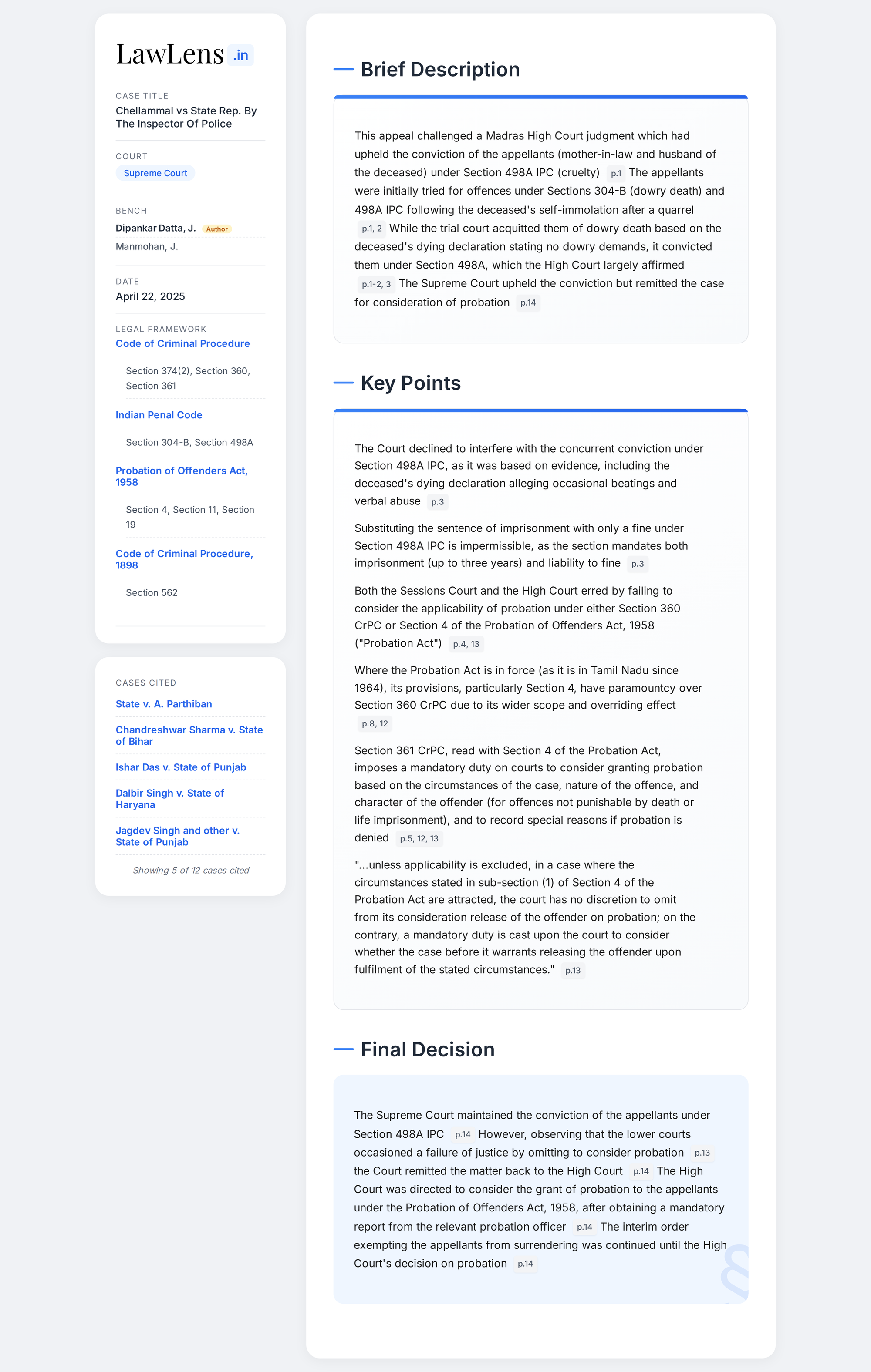 Chellammal vs State 2025 INSC 540 - S.4 Probation of Offenders Act - Ss. 360,361 CrPC - S. 498A IPC