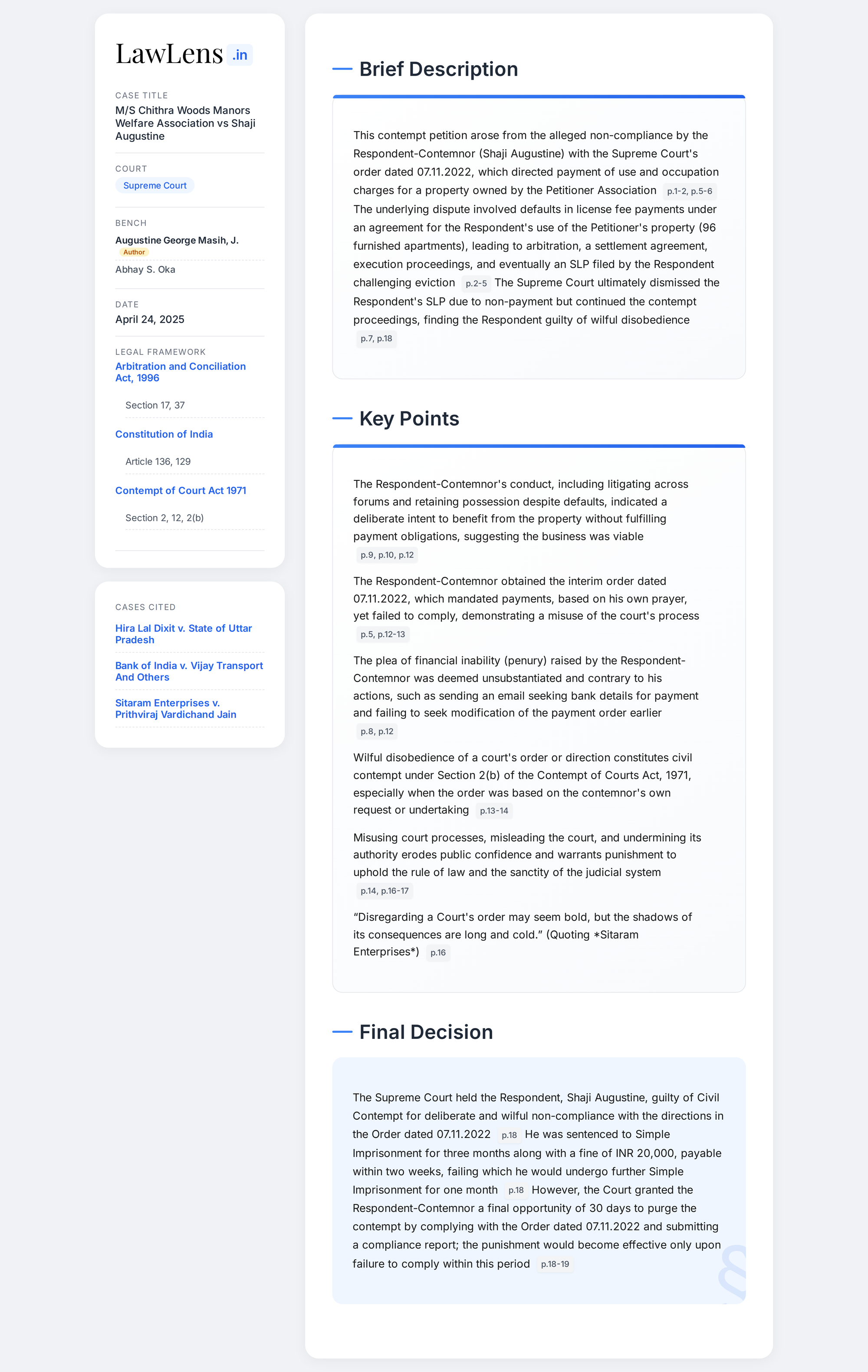 Chithra Woods Manors Welfare Association vs Shaji Augustine 2025 INSC 567 -Contempt of Court