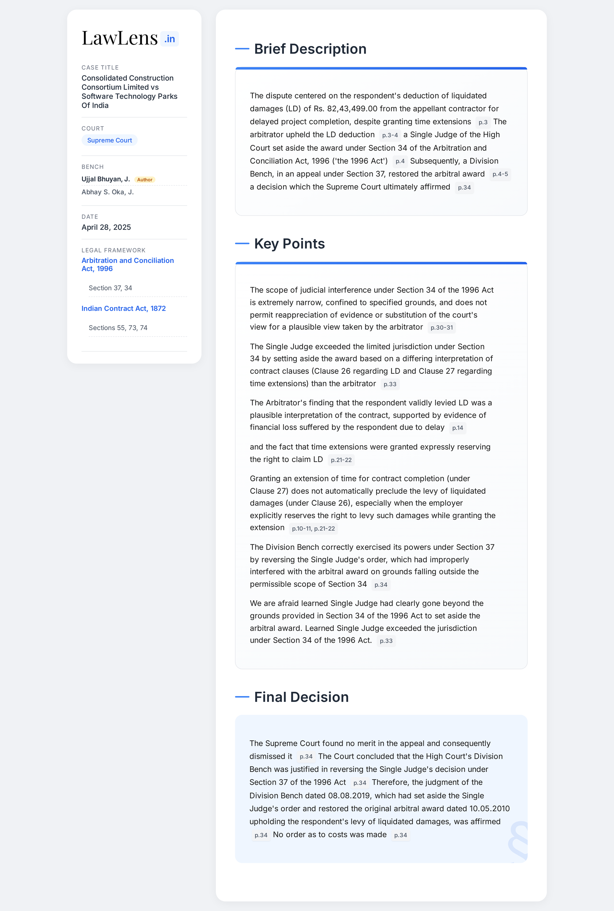 Consolidated Construction Consortium Limited vs. Software Technology Parks Of India 2025 INSC 574 - S.34Arbitration Act - Ss. 55,73,74 Contract Ac