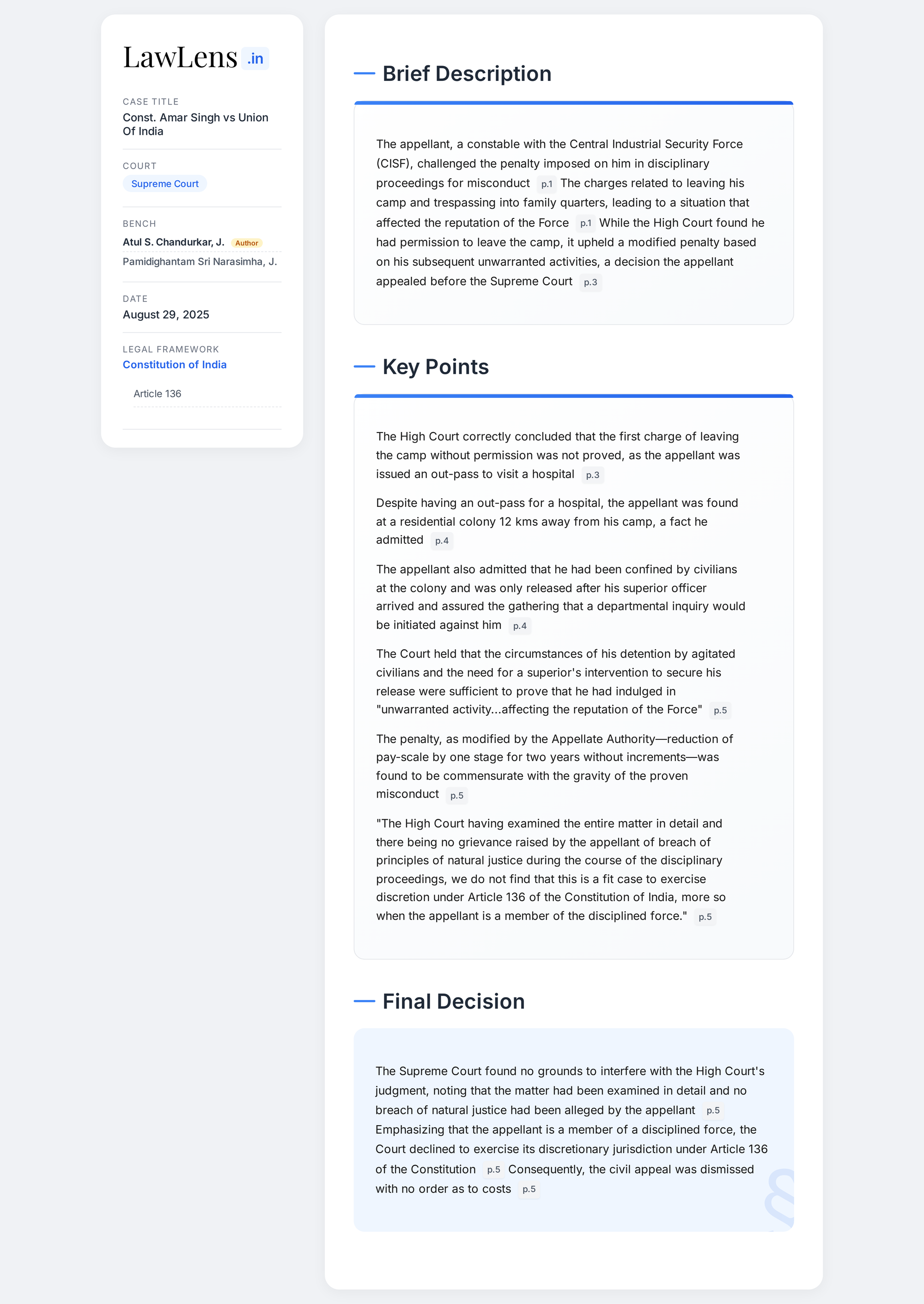 Const. Amar Singh v. Union of India 2025 INSC 1055 - CISF - Disciplinary Proceedings