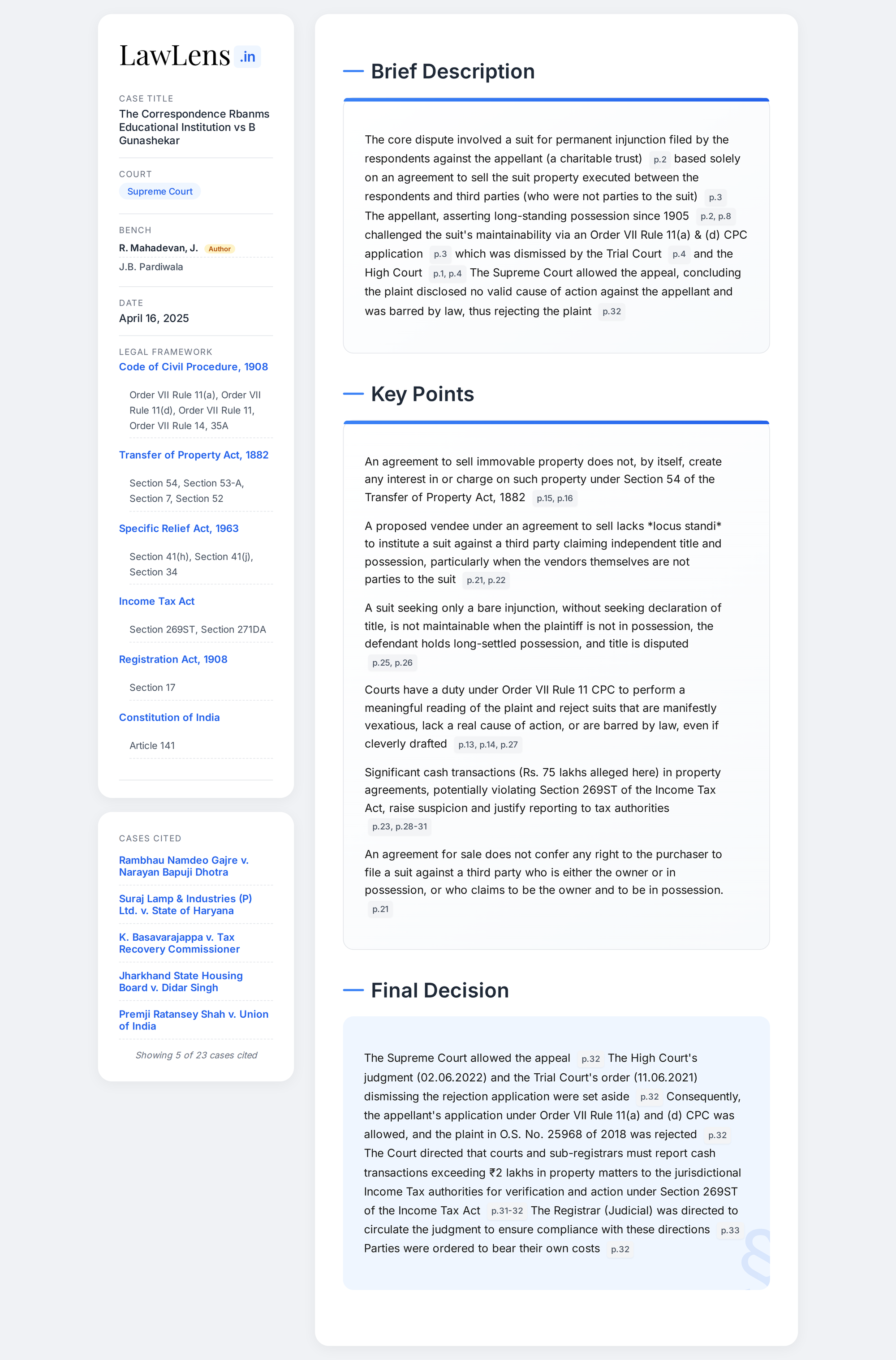 Code of Civil Procedure 1908 - Order VII Rule 11 -Order VII Rule 11 CPC serves as a crucial filter in civil litigation, enabling courts to terminate proceedings at the threshold where the plaintiff's case, even if accepted in its entirety, fails to disclose any cause of action or is barred by law, either express or by implication - There is a bounden duty on the Court to discern and identify fictitious suit, which on the face of it would be barred, but for the clever pleadings disclosing a cause of action, that is surreal. Generally, sub-clauses (a) and (d) are stand alone grounds, that can be raised by the defendant in a suit. However, it cannot be ruled out that under certain circumstances, clauses (a) and (d) can be mutually inclusive. For instances, when clever drafting veils the implied bar to disclose the cause of action; it then becomes the duty of the Court to lift the veil and expose the bar to reject the suit at the threshold. The power to reject a plaint under this provision is not merely procedural but substantive, aimed at preventing abuse of the judicial process and ensuring that court time is not wasted on fictitious claims failing to disclose any cause of action to sustain the suit or barred by law. (Para 14.1) - Only averments in the plaint are to be considered under Order VII Rule 11 CPC. While it is true that the defendant's defense is not to be considered at this stage, this does not mean that the court must accept patently untenable claims or shut its eyes to settled principles of law and put the parties to trial, even in cases which are barred and the cause of action is fictitious. (Para 17) When the defects go to the root of the case, barred by law with fictitious allegations and are incurable, no amount of evidence can salvage the case (Para 16) Merely including a paragraph on cause of action is not sufficient but rather, on a meaningful reading of the plaint and the documents, it must disclose a cause of action. The plaint should contain such cause of action that discloses all the necessary facts required in law to sustain the suit and not mere statements of fact which fail to disclose a legal right of the plaintiff to sue and breach or violation by the defendant(s). It is pertinent to note here that even if a right is found, unless there is a violation or breach of that right by the defendant, the cause of action should be deemed to be unreal. This is where the substantive laws like Specific Relief Act, 1963, Contract Act, 1872, and Transfer of Property Act, 1882, come into operation. A pure question of law that can be decided at the early stage of litigation, ought to be decided at the earliest stage. In the present case, the respondents' claim based on an agreement to sell. (Para 15)