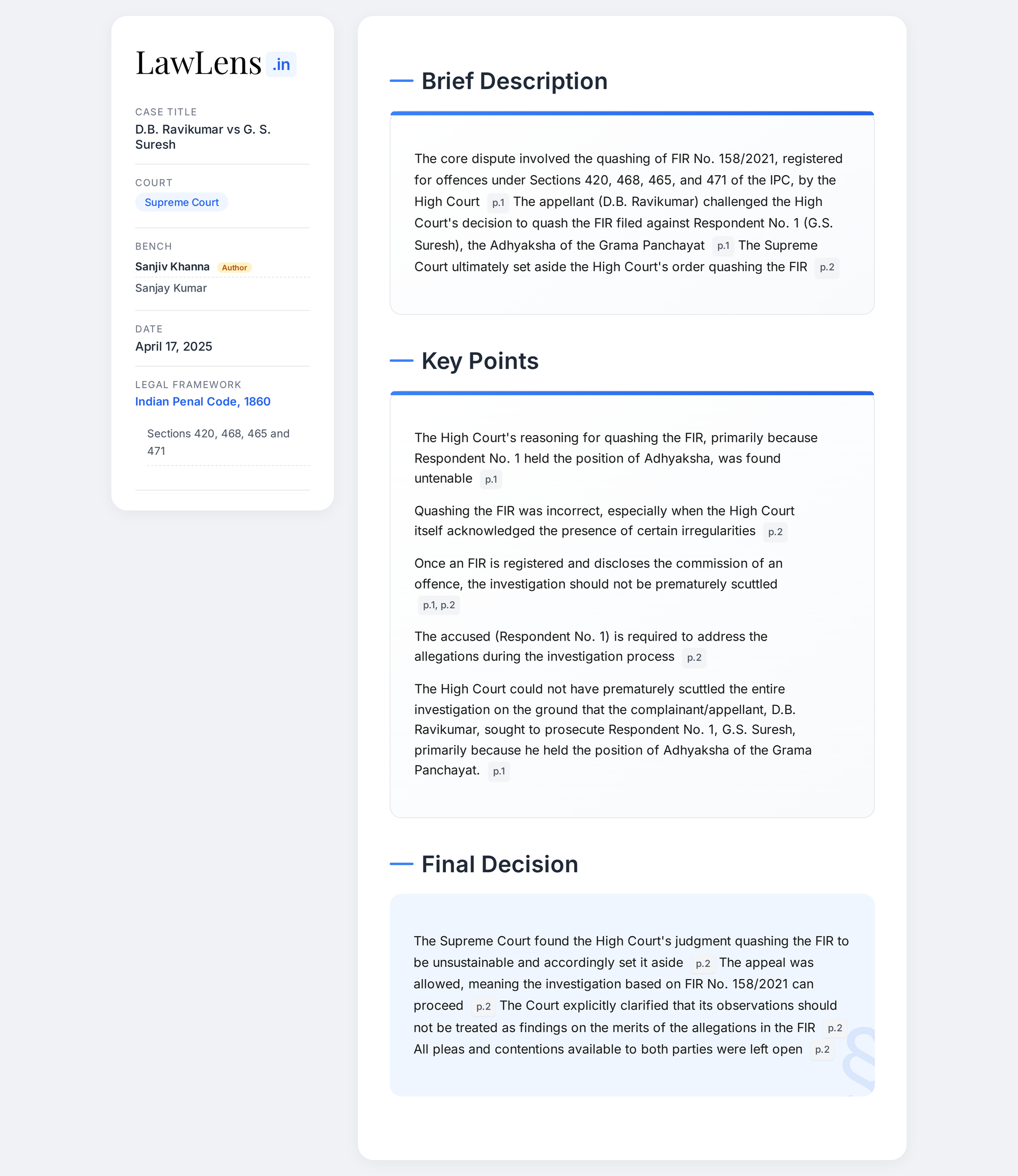 Code of Criminal Procedure 1973 - Section 482 - While allowing the appeal, SC observed: The High Court could not have prematurely scuttled the entire investigation on the ground that the complainant/appellant, D.B. Ravikumar, sought to prosecute Respondent No. 1, G.S. Suresh, primarily because he held the position of Adhyaksha of the Grama Panchayat- Therefore, as the FIR discloses the commission of an offence, the High Court ought not to have quashed it solely on the aforementioned ground.
