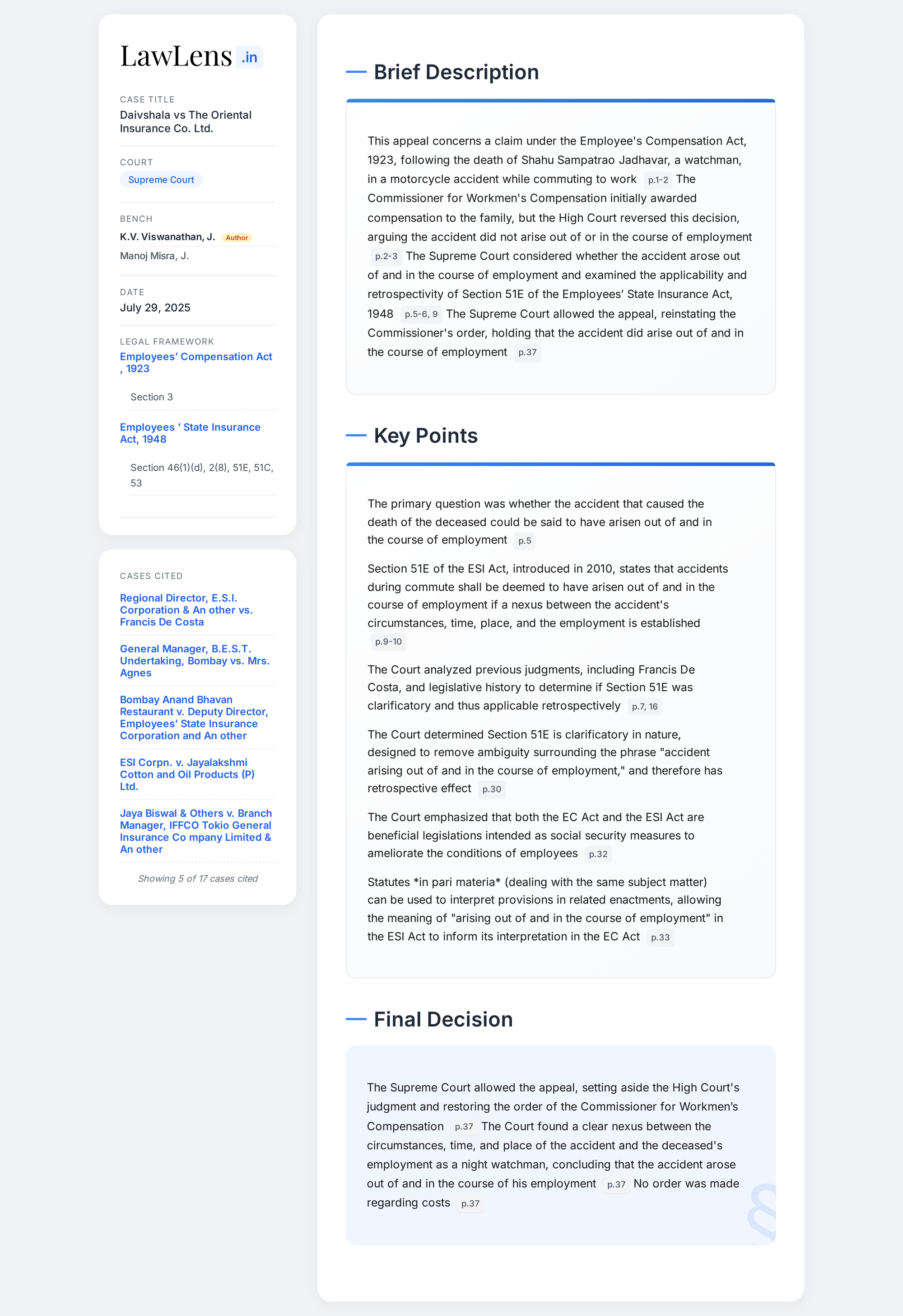 Daivshala vs Oriental Insurance Company Ltd. 2025 INSC 904 - S.3 Employees Compensation Act - Accident Occurring To Employee