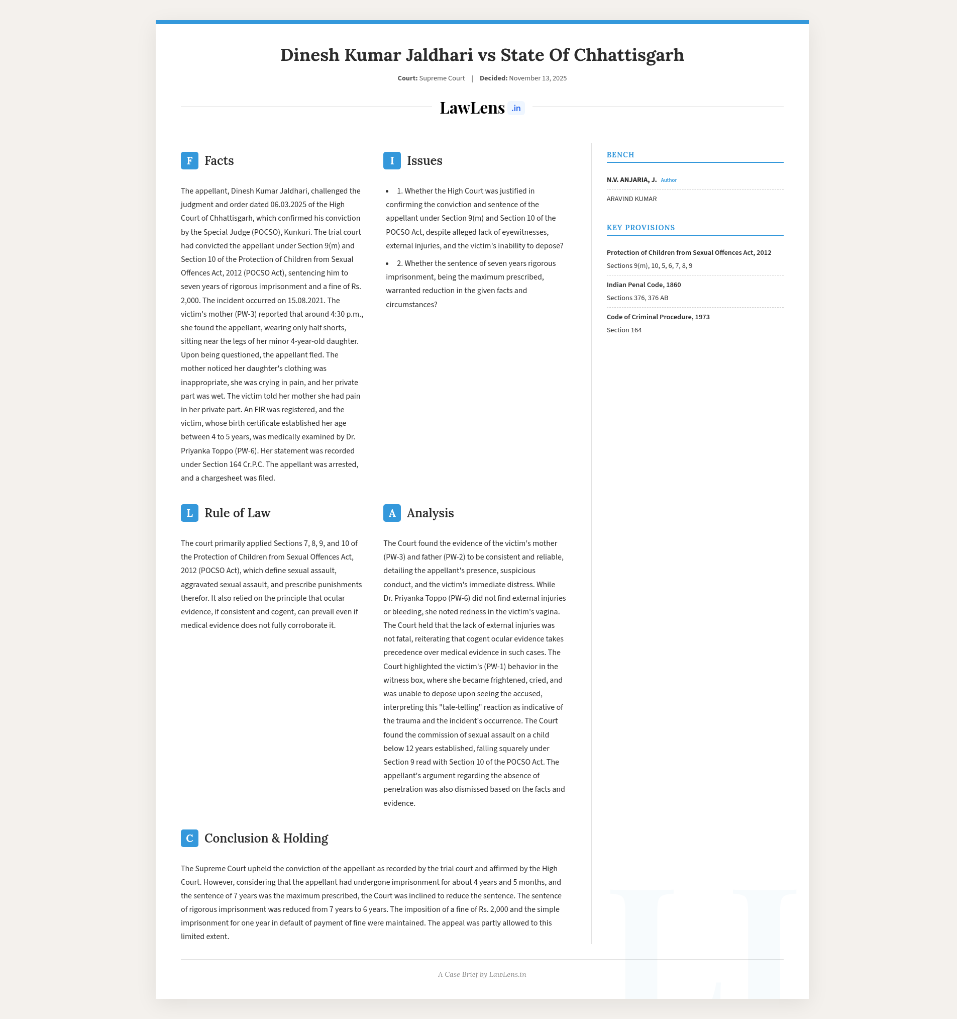Dinesh Kumar Jaldhari v. State of Chhattisgarh; 2025 INSC 1317 - POCSO - Ocular Evidence vs Medical Evidence