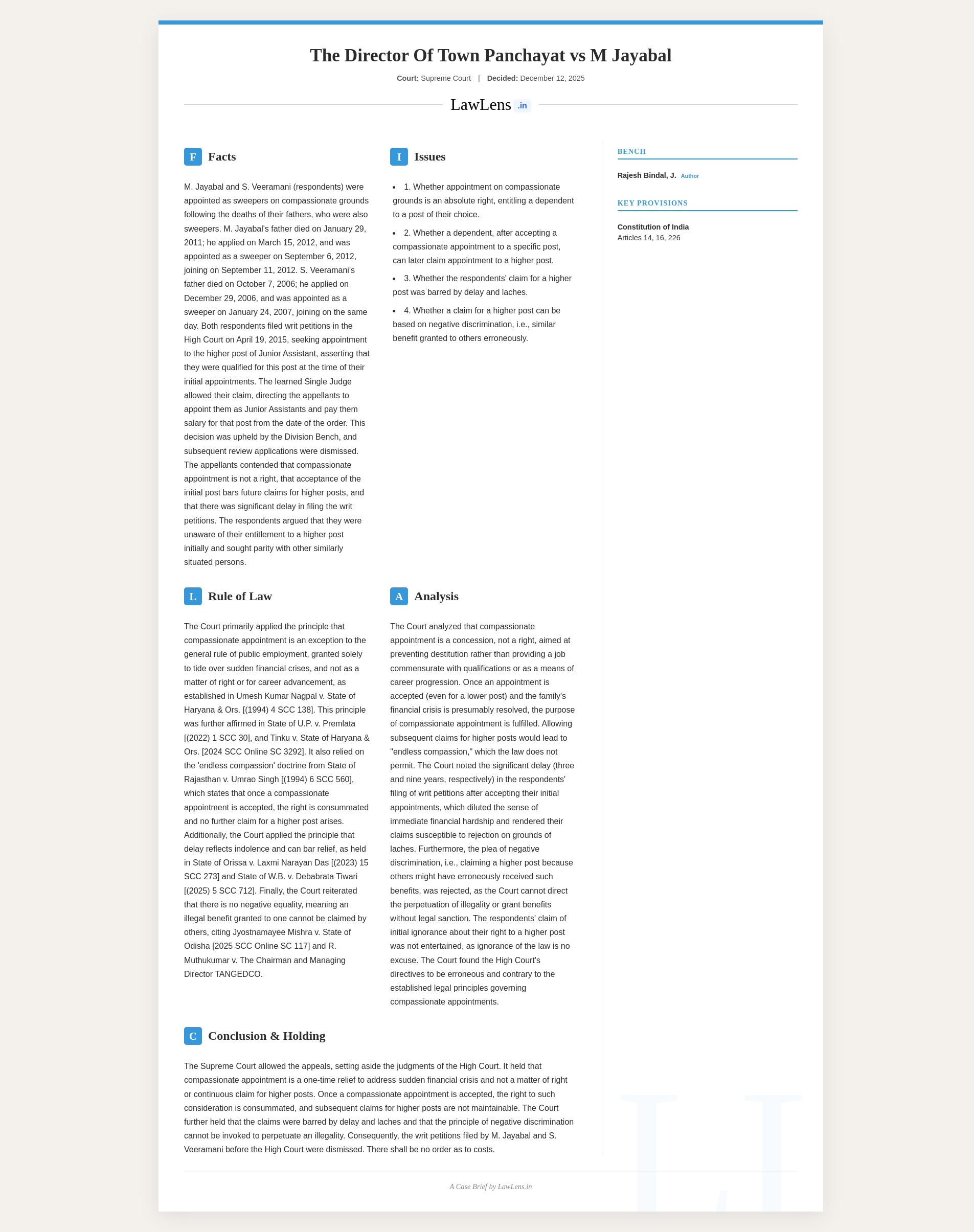 Director of Town Panchayat v. M. Jayabal 2025 INSC 1423 - Compassionate Appointment - Negative Discrimination - Delay