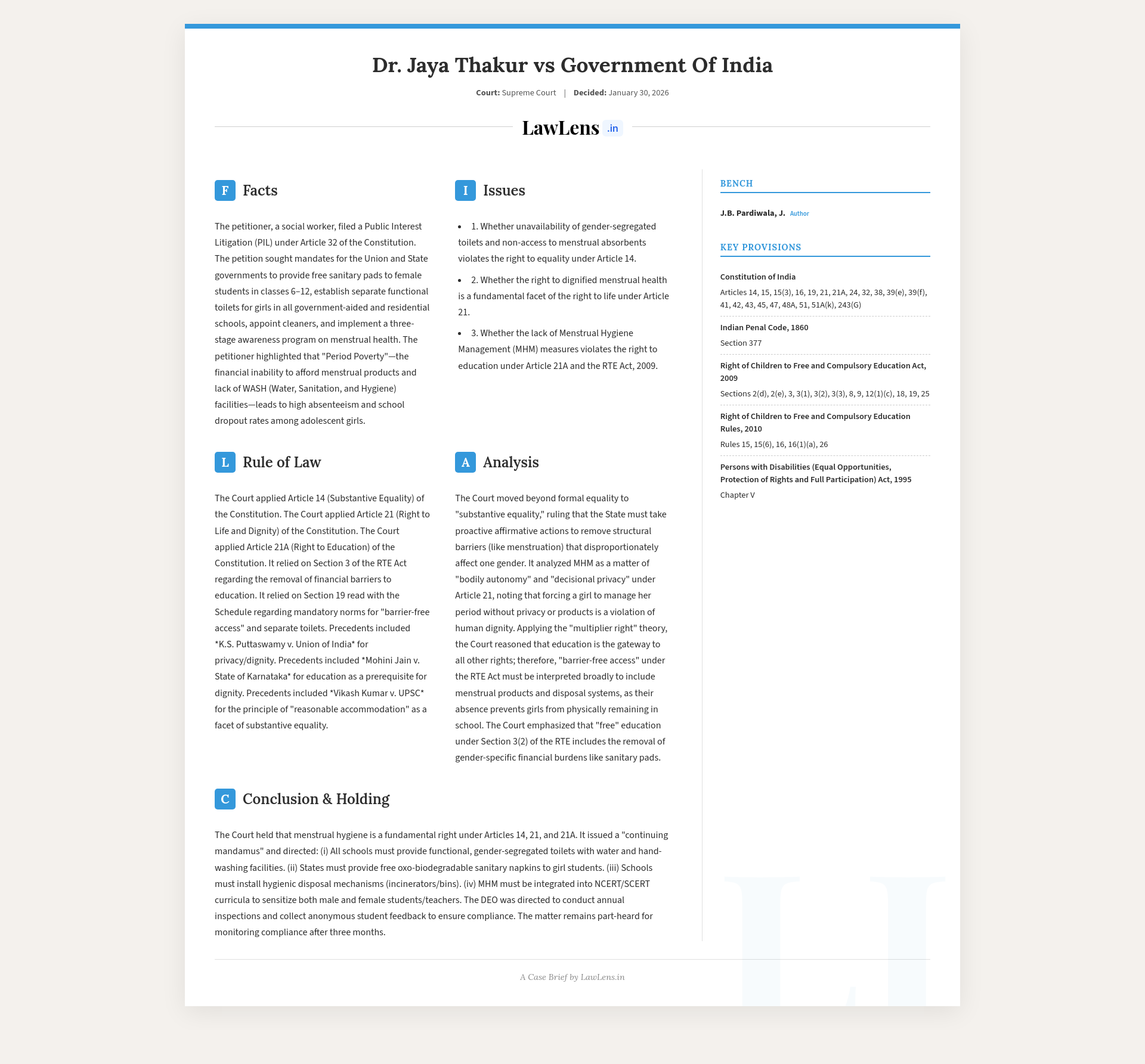 Dr. Jaya Thakur v. Government of India 2026 INSC 97 - Fundamental Right To Menstrual Health - School Girls