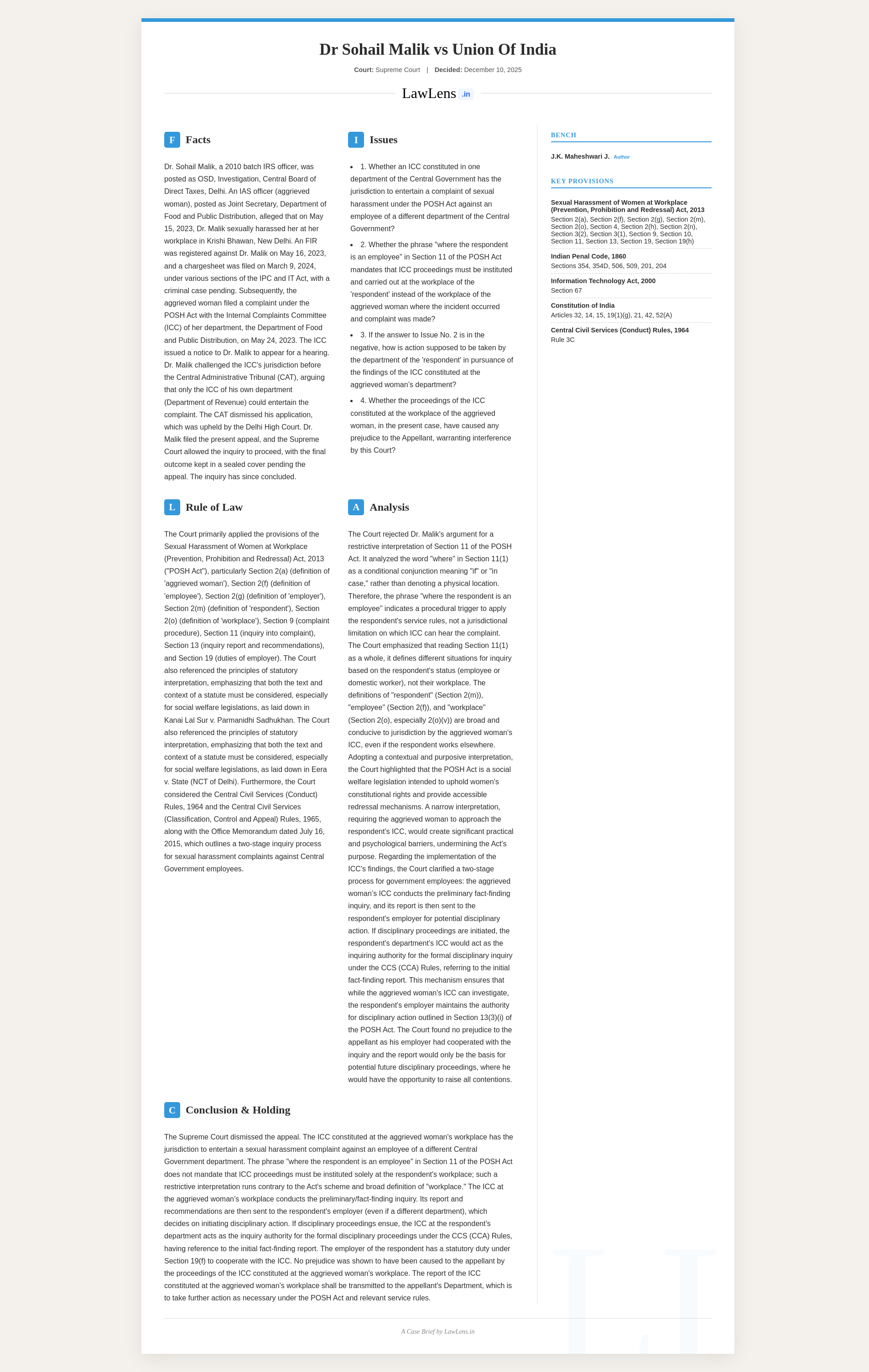 Dr. Sohail Malik v. Union of India 2025 INSC 1415 - S.11 POSH Act