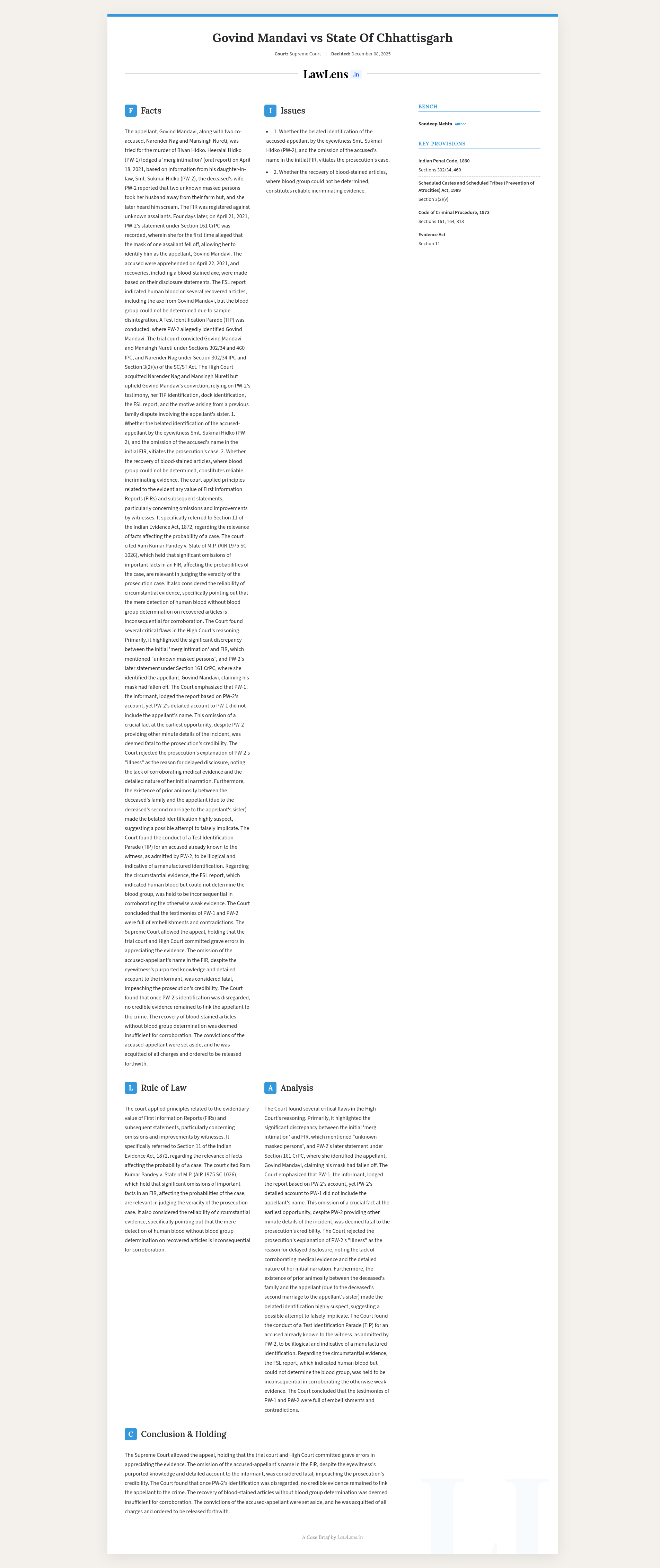Govind Mandavi v. State of Chhattisgarh; 2025 INSC 1399 - FIR - Omission Of Accused Name