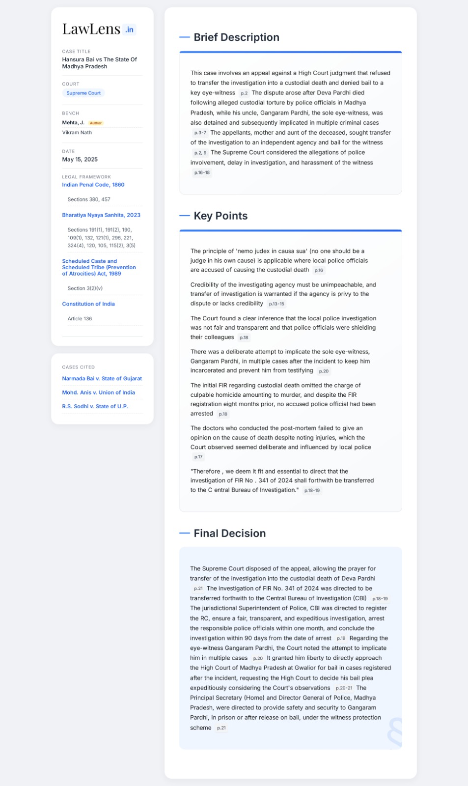 Hansura Bai vs State Of Madhya Pradesh 2025 INSC 711 - Transfer Of Criminal Investigation - Custodial Death