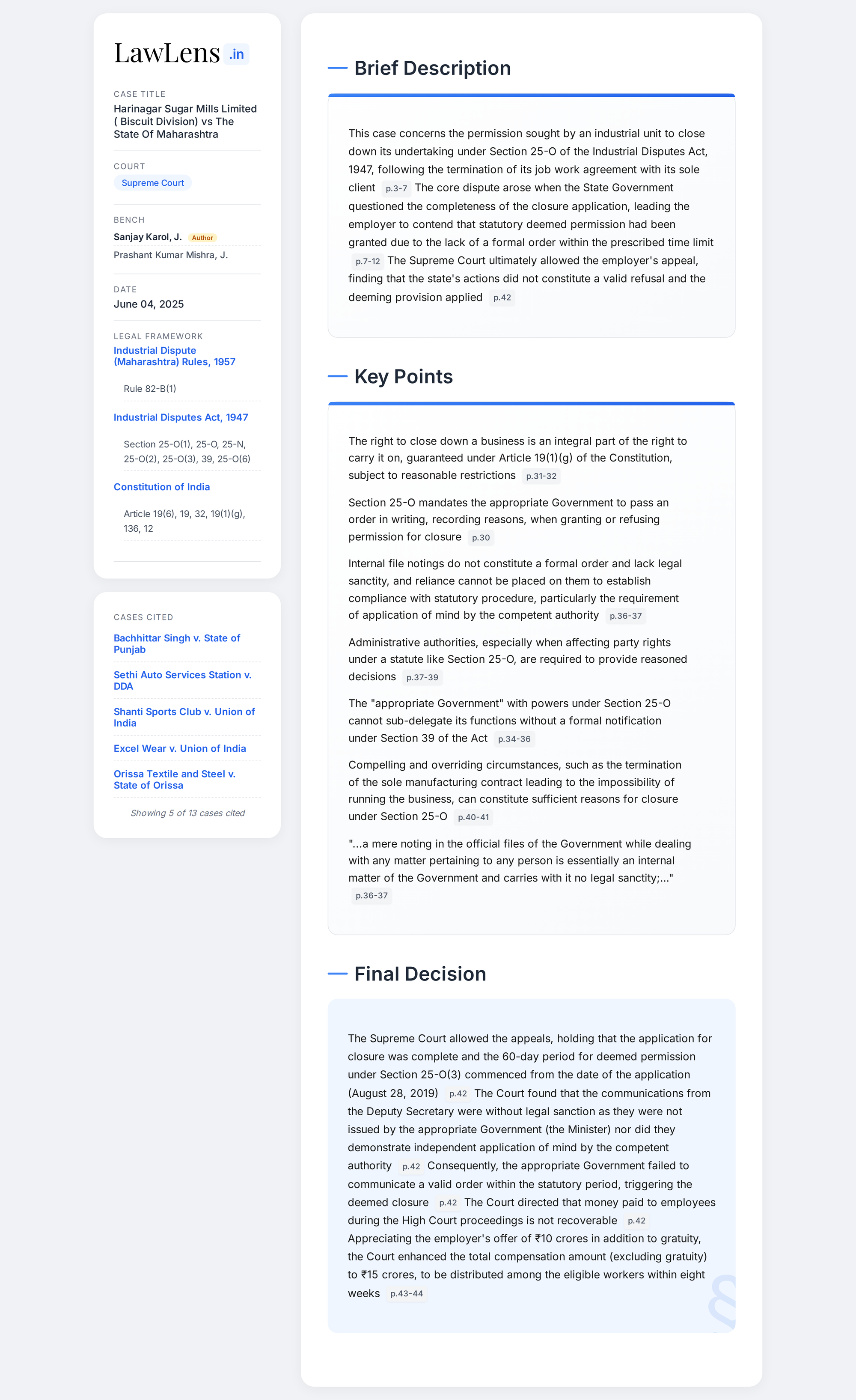 Harinagar Sugar Mills Ltd. (Biscuit Division) vs State Of Maharashtra 2025 INSC 801 - S.25-O Industrial Disputes Act - Right To Shut Down A Business