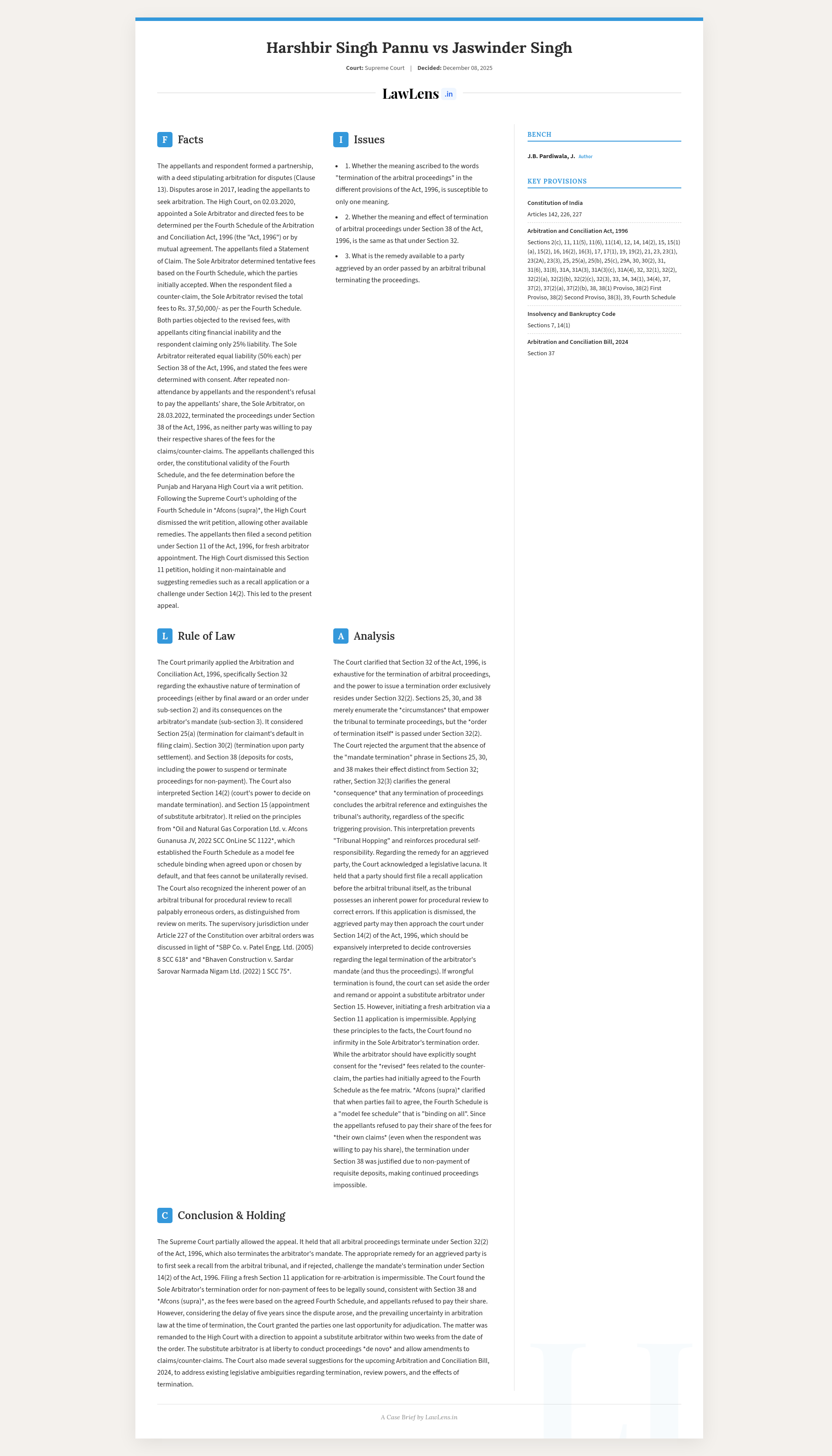 Harshbir Singh Pannu v. Jaswinder Singh 2025 INSC 1400 -S.32 Arbitration Act - Termination