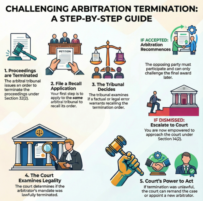 A3: The appropriate remedy for a party aggrieved by an order terminating the proceedings is to first file an application for recall of that order before the arbitral tribunal itself,. The tribunal possesses the inherent procedural power to recall such an order to correct an error apparent on the face of the record or address an overlooked material fact,.